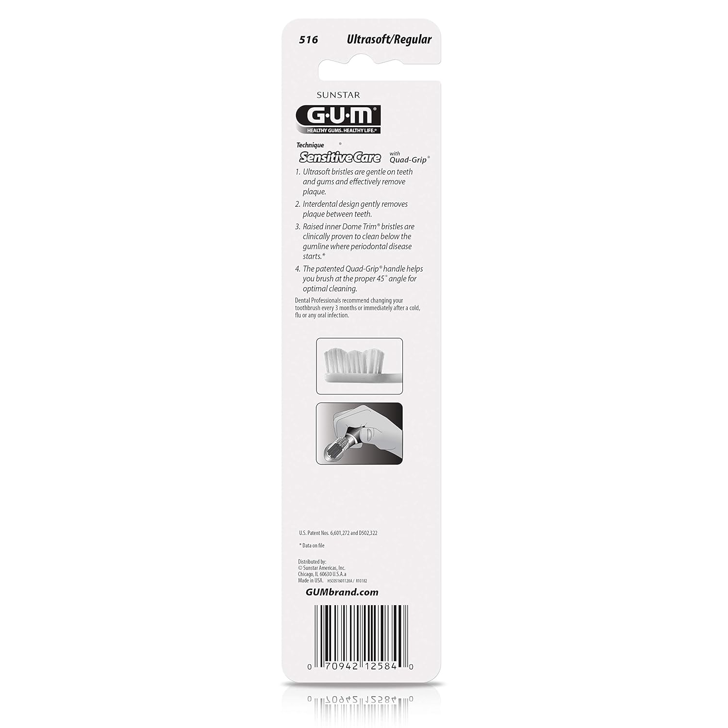 Product Description Start brushing with the proper technique, with the GUM Technique Sensitive Care Toothbrush. With its soft bristles that will clean sensitive teeth and GUM s without pain and irritation, and it's specially designed handle that intuitively helps you brush at the recommended 45-degree angle, this toothbrush goes above and beyond for your oral health. One of the most stand-out features of the GUM Technique Sensitive Care toothbrush is its clinically designed handle. With its quad grip design, this toothbrush handle helps you intuitively hold the toothbrush at the 45-degree angle that dentists and dental hygienists recommend. The result is better removal of dental plaque, food particles, and biofilm from your teeth and GUM s. Meanwhile, the brush head comes with ultra-soft bristles that won't irritate sensitive teeth and GUM s. These bristles feature a dome trim giving them the ability to clean below the GUM line where periodontal disease starts. It's hard to remember to hold your toothbrush at the 45-degree angle that dentists and dental hygienists recommend. Fortunately, you don't have to remember. The GUM Technique Sensitive Care Toothbrush is designed to do the work for you, as you take your oral health one step further. Manufacturer Contact Information 1-888-777-3101,QUAD-GRIP HANDLE: This toothbrush features a unique and ergonomic Quad-Grip handle that intuitively reminds users to brush at the 45-degree angle that dentists and dental hygienists recommend. This ensures the proper “technique.”,DOME TRIM BRISTLE DESIGN: The GUM Technique Sensitive Care Toothbrush comes with dome trim bristles. This bristle trim helps to clean teeth at the 45-degree angle recommended by dental professionals allowing it to disrupt plaque beneath the GUM line,ULTRA-SOFT BRISTLES: The toothbrush head features bristles with an ultra-soft texture that are gentle but effective at cleaning dental plaque and food particles without irritating sensitive teeth and GUM s,PREMIUM CLEANING: This toothbrush design allows for optimal dental plaque removal and helps prevent the development of tooth decay and GUM disease by cleaning the hard-to-reach areas above, below and along the GUM line and between the teeth,HEALTHY STARTS HERE : Research continues to show the connection between oral health and overall health. The GUM brand is committed to providing innovative oral care products that make between teeth cleaning accessible for everyone