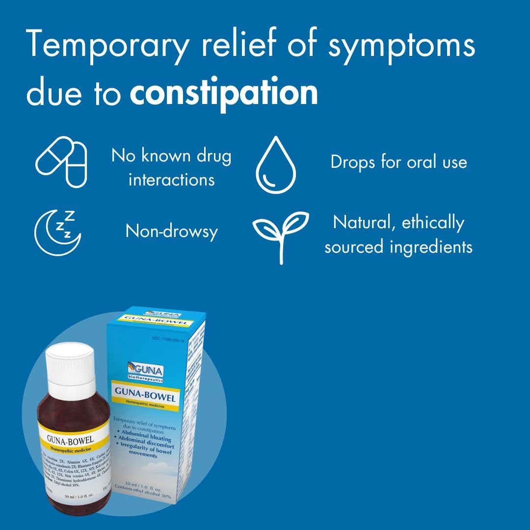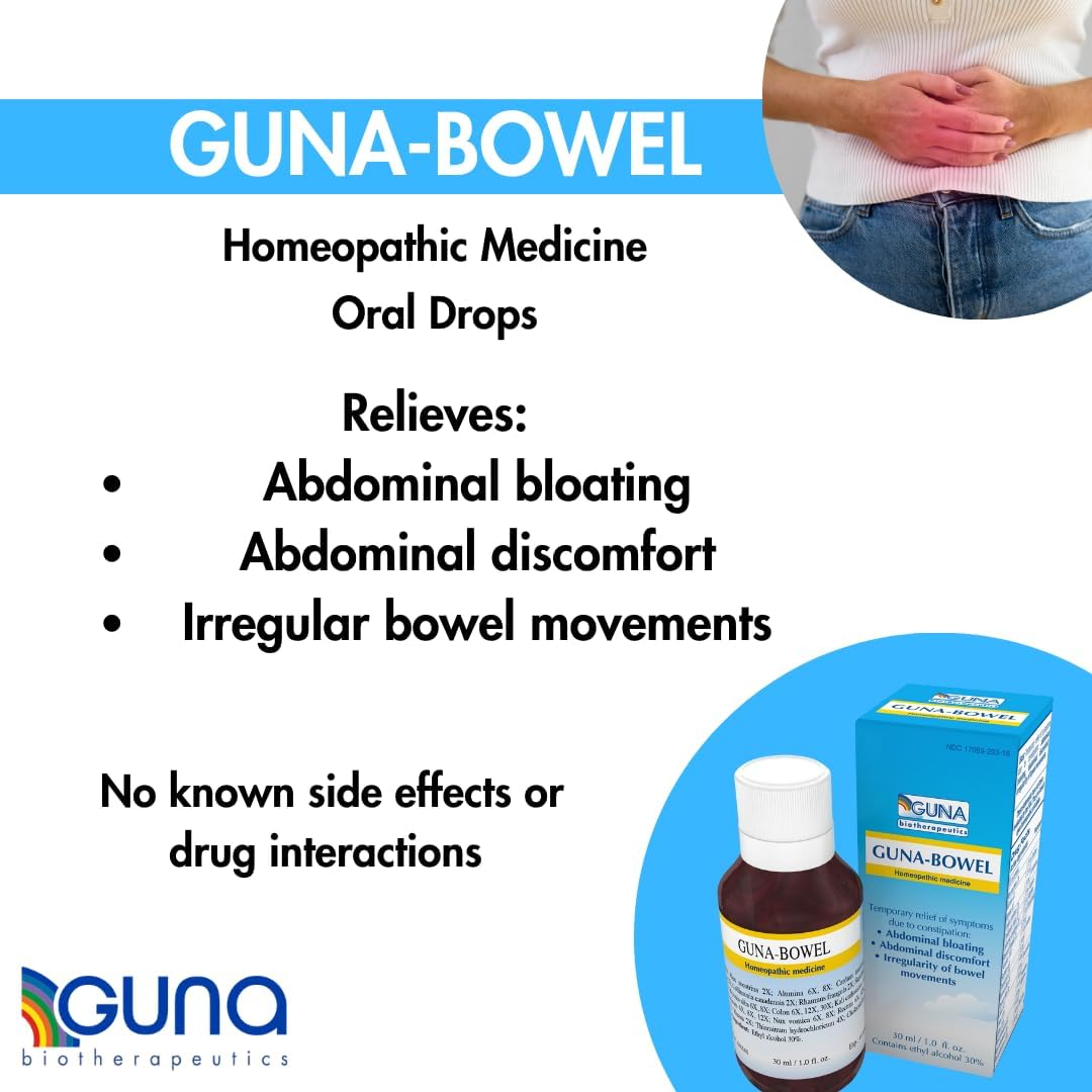 About this item Guna Bowel provides digestive support due to constipation: abdominal bloating, abdominal discomfort, irregularity of bowel movements Guna Bowel homeopathic digestive remedy works naturally with your body to support digestive health. Our homeopathic formula is a multi-ingredient formula of 16 homeopathic ingredients that each individually support digestive system and provide Intensive Bowel Support, For Women & Men. Support for occasional bloating, gut Health, constipation symptoms, such as abdominal bloating, abdominal discomfort, irregular bowel movements. GUNA's gentle homeopathic formulas are made with all natural active ingredients. May be taken concurrently with other conventional medications. GUNA's products are inspired by studies of molecular biology and biochemistry performed on medicinal plants and on biological molecules. These studies demonstrate that low doses of active ingredients prepared according to an exclusive proprietary technology are as effective as higher doses, but with a low risk of negative side effects. See more product details,Guna Bowel provides digestive support due to constipation: abdominal bloating, abdominal discomfort, irregularity of bowel movements,Guna Bowel homeopathic digestive remedy works naturally with your body to support digestive health,Our homeopathic formula is a multi-ingredient formula of 16 homeopathic ingredients that each individually support digestive system and provide Intensive Bowel Support, For Women & Men. Support for occasional bloating, gut Health, constipation symptoms, such as abdominal bloating, abdominal discomfort, irregular bowel movements,GUNA's gentle homeopathic formulas are made with all natural active ingredients. May be taken concurrently with other conventional medications,GUNA's products are inspired by studies of molecular biology and biochemistry performed on medicinal plants and on biological molecules. These studies demonstrate that low doses of active ingredients prepared according to an exclusive proprietary technology are as effective as higher doses, but with a low risk of negative side effects