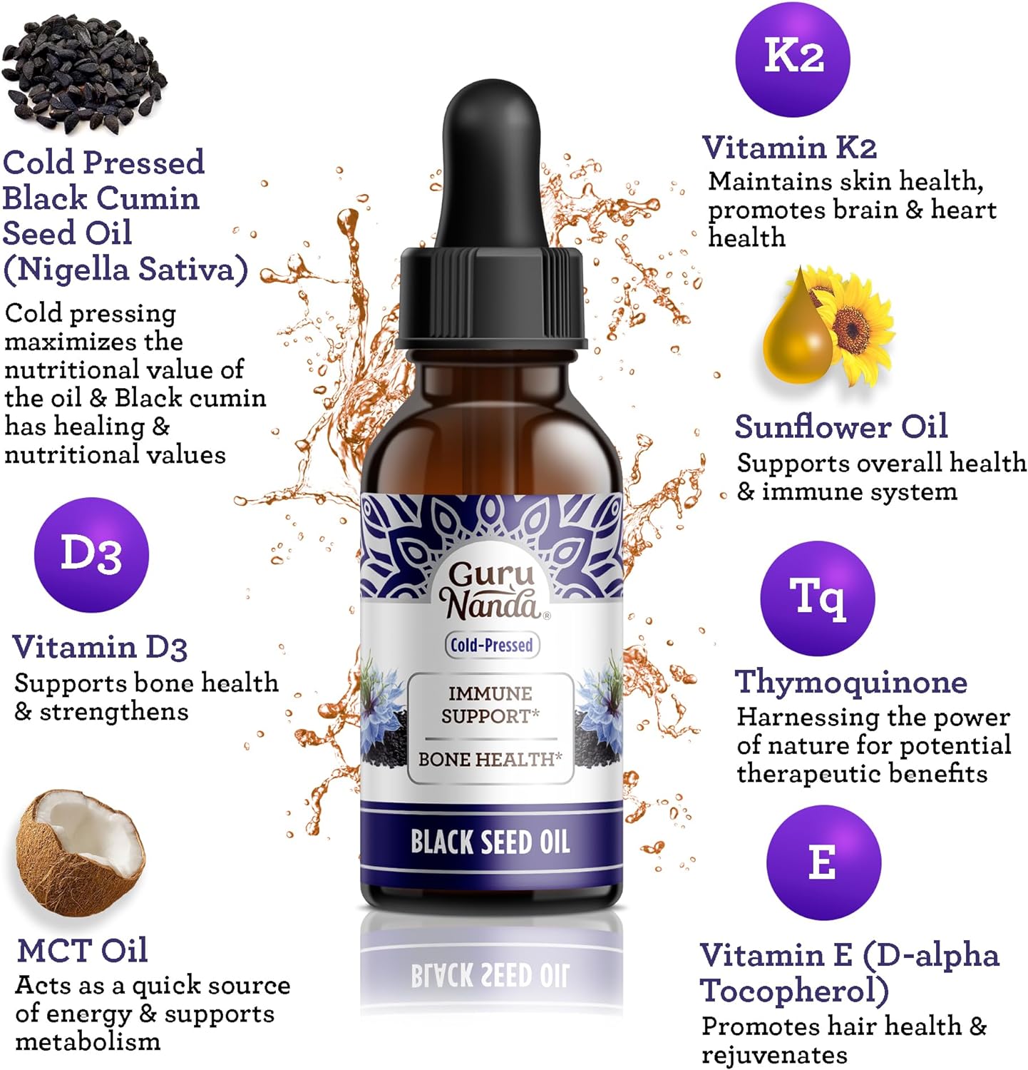 Gurunanda Black Seed Oil, Cold-Pressed Nigella Sativa - Rich In Vitamin D3 5000 Units, K2 & E, High Thymoquinone | Potent Antioxidant For Immune Support, Non-Gmo, 2 Fl.Oz