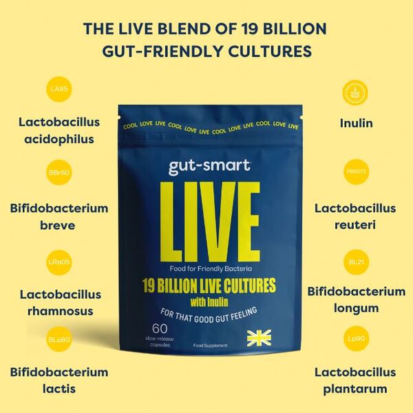 LIVE is a powerful blend of friendly bacteria Lactobacillus and Bifidobacterium with Inulin. Encased in a slow-release capsule, it defies stomach acidity, guaranteeing a safe journey to the gut. With LIVE, your gut gets the full benefits without interference.Inulin acts as a prebiotic stimulating the growth of good bacteria and helping to decrease harmful bacteria, supporting gut health.Probiotics are beneficial bacteria that support digestive health by balancing the gut microbiome. They aid in digestion, nutrient absorption, and immune function. Additionally, probiotics can help alleviate digestive issues like bloating, gas, and diarrhoea, and promote overall well-being.With a whopping 19 Billion live cultures, LIVE enriches the 'friendly' bacterial ecosystem of your gut microbiome - it's like a party for your gut!
