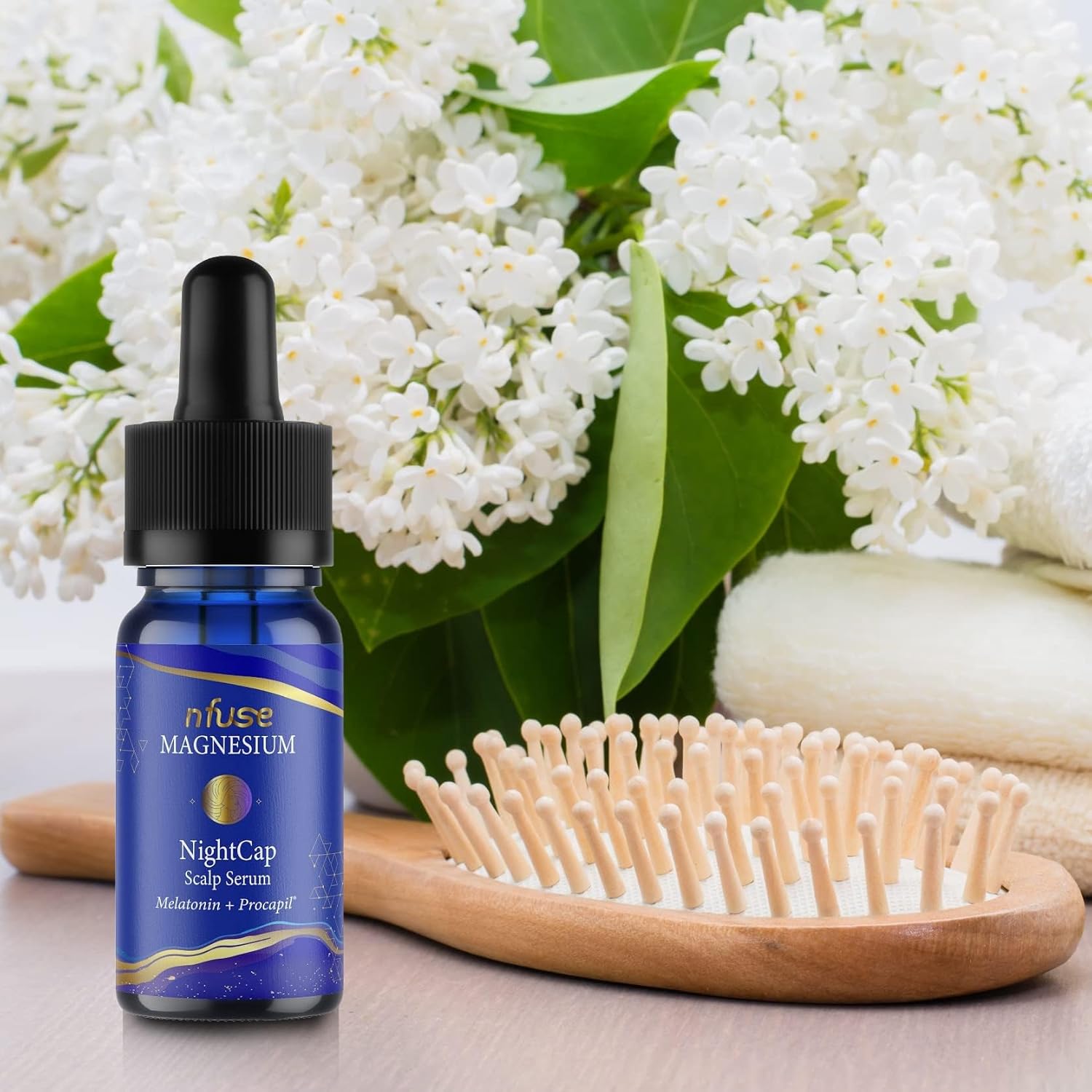 About this item NIGHTTIME HAIR GROWTH SERUM WITH MAGNESIUM, PEPTIDES & MELATONIN: Transform your hair while you sleep. nfuse NightCap Hair Growth Serum combines melatonin, Procapil (peptides for hair growth), and magnesium to visibly restore fuller, thicker, healthier-looking hair. Clinically proven to support new hair growth and reduce shedding. CALMING SCALP SERUM WITH 220MG MAGNESIUM: Formulated with 220mg of magnesium per application, this soothing serum helps nourish the scalp and support overall scalp wellness. Ideal for use during your nighttime self-care routine. CLINICALLY BACKED INGREDIENTS THAT DELIVER RESULTS – Powered by Procapil peptide complex, shown to reduce hair fall by up to 46% and boost hair density by 121%. Plus, enhance follicle activity and circulation. UNSCENTED, CLEAN FORMULA FOR ALL HAIR TYPES: Lightweight, residue-free, and fragrance-free, this easy-to-use nighttime serum absorbs quickly and works for curly, straight, thinning, or color-treated hair. Apply before bed, then rinse in the morning or after 30 minutes. VEGAN, CRUELTY-FREE & MADE IN THE USA: nfuse Hair Growth Serum is free from parabens, sulfates, silicones, phthalates, and artificial fragrances. Leaping Bunny Certified, Women-Owned, Vegan, and proudly formulated in the USA. EXPERIENCE THE SLEEP COLLECTION: Pair with nfuse Magnesium Sleep Lotion with Melatonin and Lavender Essential Oils for an even deeper state of calm. › See more product details,NIGHTTIME HAIR GROWTH SERUM WITH MAGNESIUM, PEPTIDES & MELATONIN: Transform your hair while you sleep. nfuse NightCap Hair Growth Serum combines melatonin, Procapil (peptides for hair growth), and magnesium to visibly restore fuller, thicker, healthier-looking hair. Clinically proven to support new hair growth and reduce shedding,CALMING SCALP SERUM WITH 220MG MAGNESIUM: Formulated with 220mg of magnesium per application, this soothing serum helps nourish the scalp and support overall scalp wellness. Ideal for use during your nighttime self-care routine,CLINICALLY BACKED INGREDIENTS THAT DELIVER RESULTS – Powered by Procapil peptide complex, shown to reduce hair fall by up to 46% and boost hair density by 121%. Plus, enhance follicle activity and circulation,UNSCENTED, CLEAN FORMULA FOR ALL HAIR TYPES: Lightweight, residue-free, and fragrance-free, this easy-to-use nighttime serum absorbs quickly and works for curly, straight, thinning, or color-treated hair. Apply before bed, then rinse in the morning or after 30 minutes,VEGAN, CRUELTY-FREE & MADE IN THE USA: nfuse Hair Growth Serum is free from parabens, sulfates, silicones, phthalates, and artificial fragrances. Leaping Bunny Certified, Women-Owned, Vegan, and proudly formulated in the USA,EXPERIENCE THE SLEEP COLLECTION: Pair with nfuse Magnesium Sleep Lotion with Melatonin and Lavender Essential Oils for an even deeper state of calm