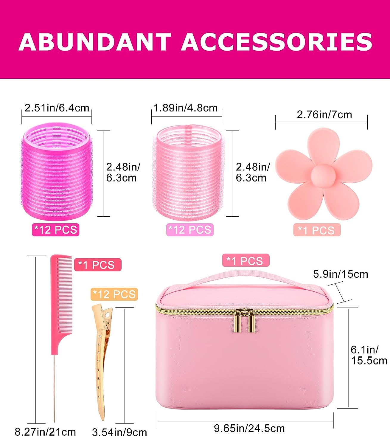 Hair Rollers - Free Makeup Carrying Case - Jumbo,Large Rollers Hair Curlers Set for Volume, Long Hair - Self Grip,No Heat Design for Blowout Look,Bangs,Curly Hair - Awesome Gift Choice - Pink