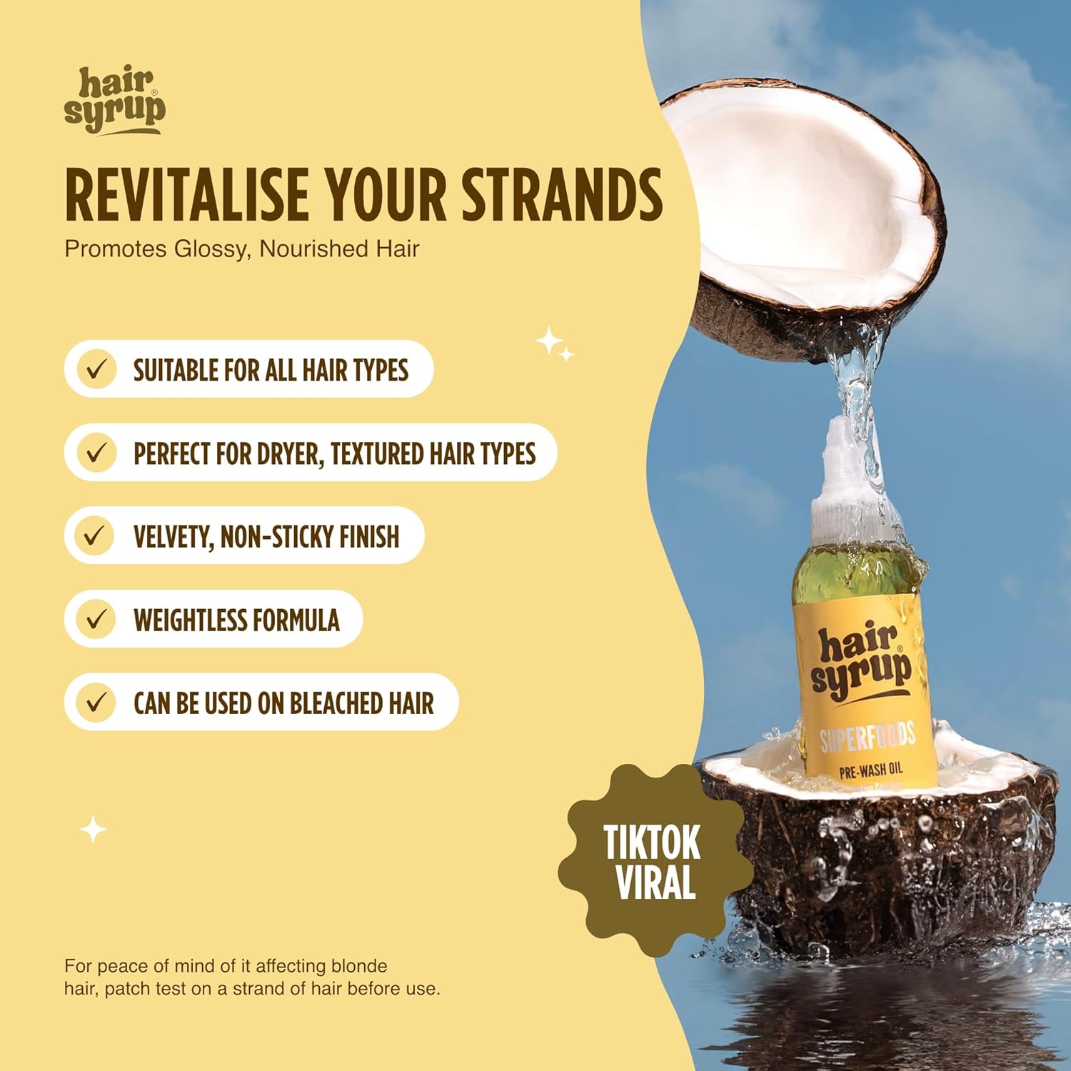 Hair Syrup | Superfoods Pre-Wash Hair Oil | Enriched With Coconut, Kiwi & Line | For Damaged, Dehydrated Hair Needing Tlc | 12 Nutrient-Rich Ingredients | 100% Natural | 300Ml Pump Bottle Applicator