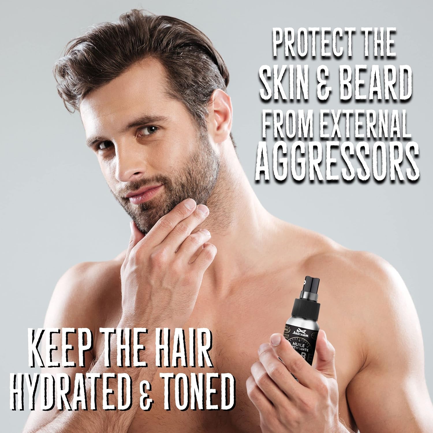 WELL WATERED BEARD HAIR - The natural oils in our hair oil for beard moisturizer keep your face and facial hair well watered all day long. The beard oil for men protects your face from dry skin and damaged hair