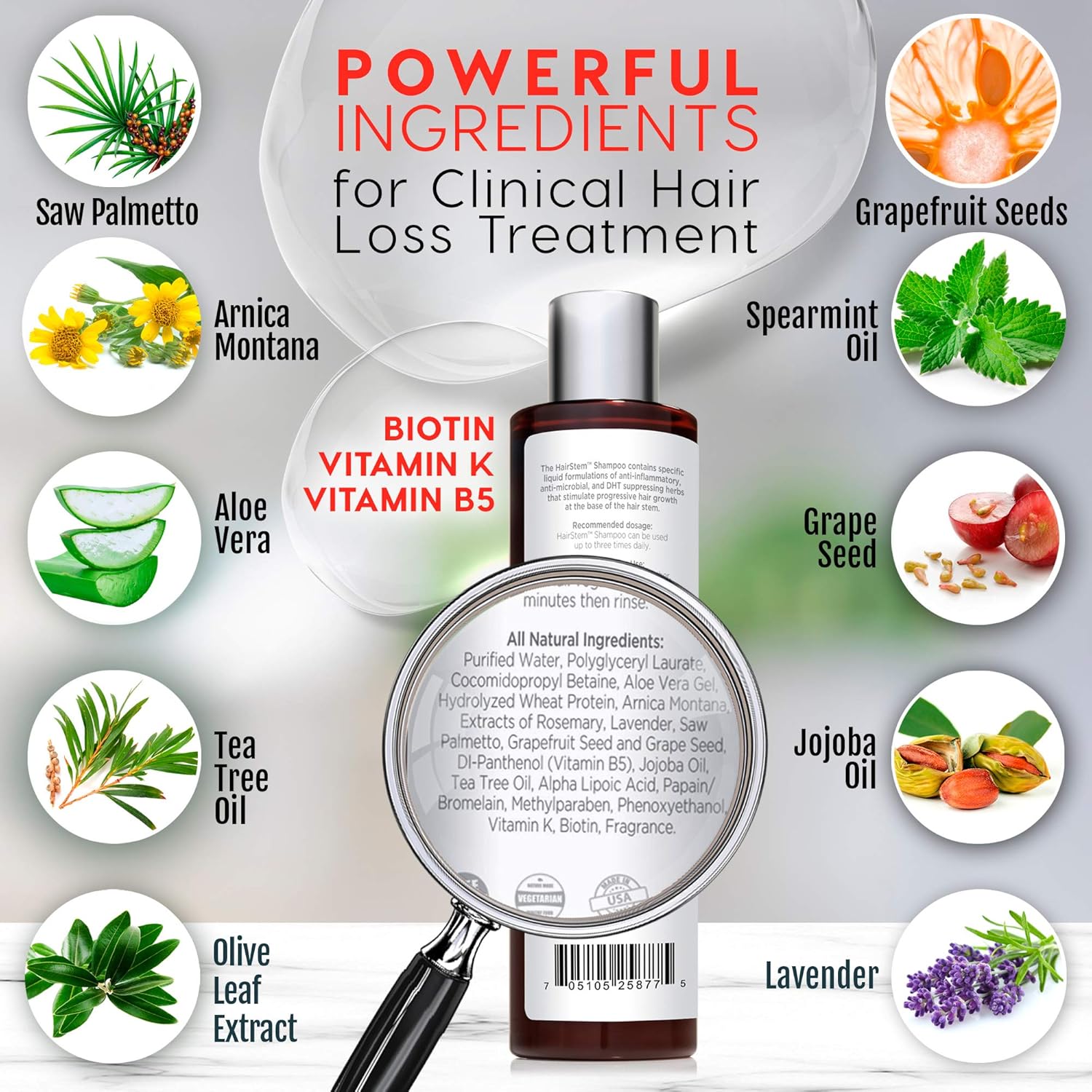 Clinically developed for hair loss treatments: sulfate free, includes high quality biotin, saw palmetto, tea tea oil, aloe, arnica montana. Our formula is noticeably volumizing, feels and smells great. The hairstem shampoo is infused with powerful vitamins, herbs, and dht blockers ideal for men and women