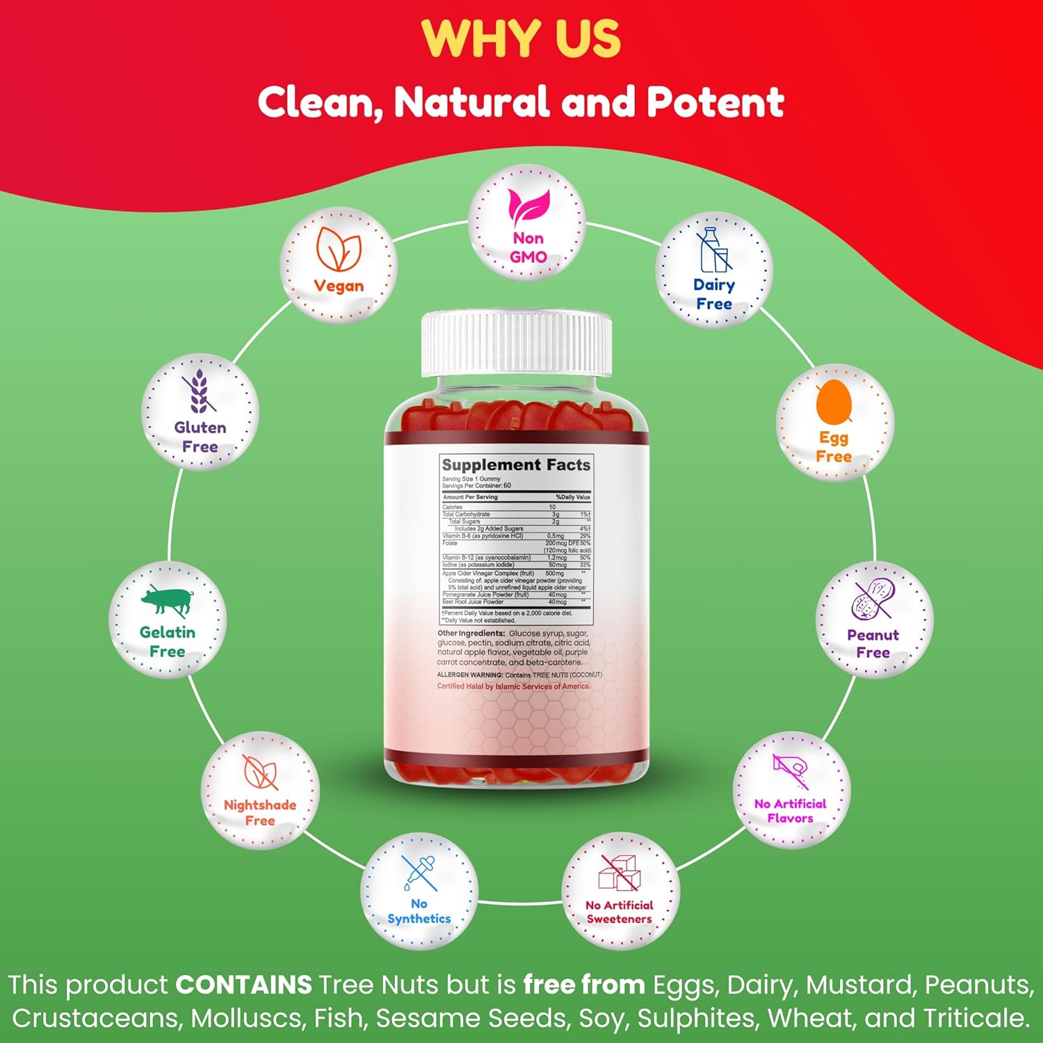 500MG HALAL ACV KETO GUMMIES : Along with 500mg of Apple Cider Vinegar Gummies with the mother, B6, B12 and Folate, our apple vinegar gummy is Halal, Vegan, Gelatin free and Non-GMO