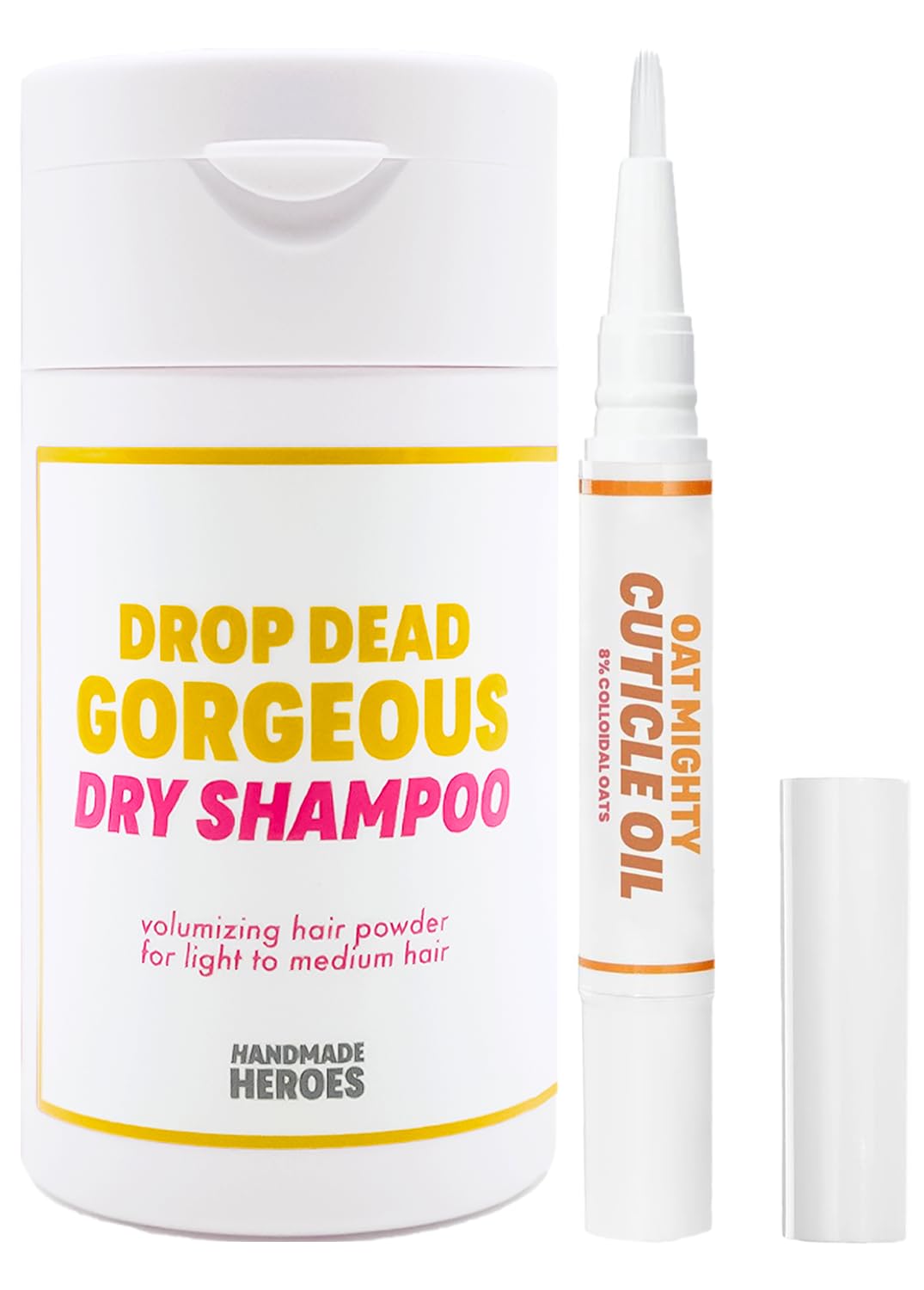 Super convenient and easy to use bundle. Hair and nail care for on the go. Fits into any purse. Great for travellingCuticle care made with 8% colloidal oats and botanical oils to provide moisture, protect, and nourish dry, brittle, cracked cuticles, nails, and skin. The nail repair for damaged nails, Oat Mighty Cuticle Oil is a nail strengthener and cuticle softener that needs to be in every manicure kit and pedicure kitNon aerosol dry shampoo powder. TSA friendly and travel friendly. No water required. Great for travelling, camping and after workoutsPlastic neutral packaging - sustainable and clean formulation. No toxic chemicals, no SLS, no parabensVegan, Cruelty free and Non toxic nail pen and dry shampoo. For peeling nails, brittle nails and eliminates hang nails and decreases skin wrinkling. Essential for good nail healthFor days when you just need a little oomph for your greasy hair. Or perhaps, you are laying off the nasty chemicals from shampoos. Or maybe, just maybe, you are a little like us and more often than not, miss a good wash every now and then. Fret not! We've got you covered with our Drop Dead Gorgeous Dry Shampoo! Cuticle oil boosted with 8% colloidal oat extract to nourish and repair nails and cuticles. Made with a synergistic blend of naturally light oils, 8% colloidal oils and vitamin E, this conditioning treatment offers intense therapy for dry, damaged cuticles, as well as nails and skin. The fast-acting, super-penetrating formula softens cuticles and promotes strong, flexible nails that hold color and enhancements better