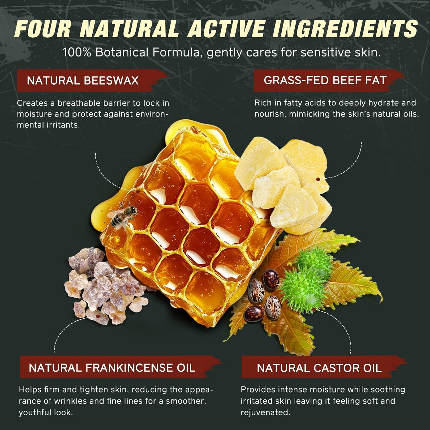 Beef Tallow Castor Oil Frankincense Balm, Non-Greasy Texture------ Absorbs quickly without leaving a greasy feel, ideal for both face and body use promoting healthy, smooth skin. When use this tallow, honey, castor oil and frankincense balm for face and body, it deeply moisturizes and nourishes your skin, leaving it soft and supple