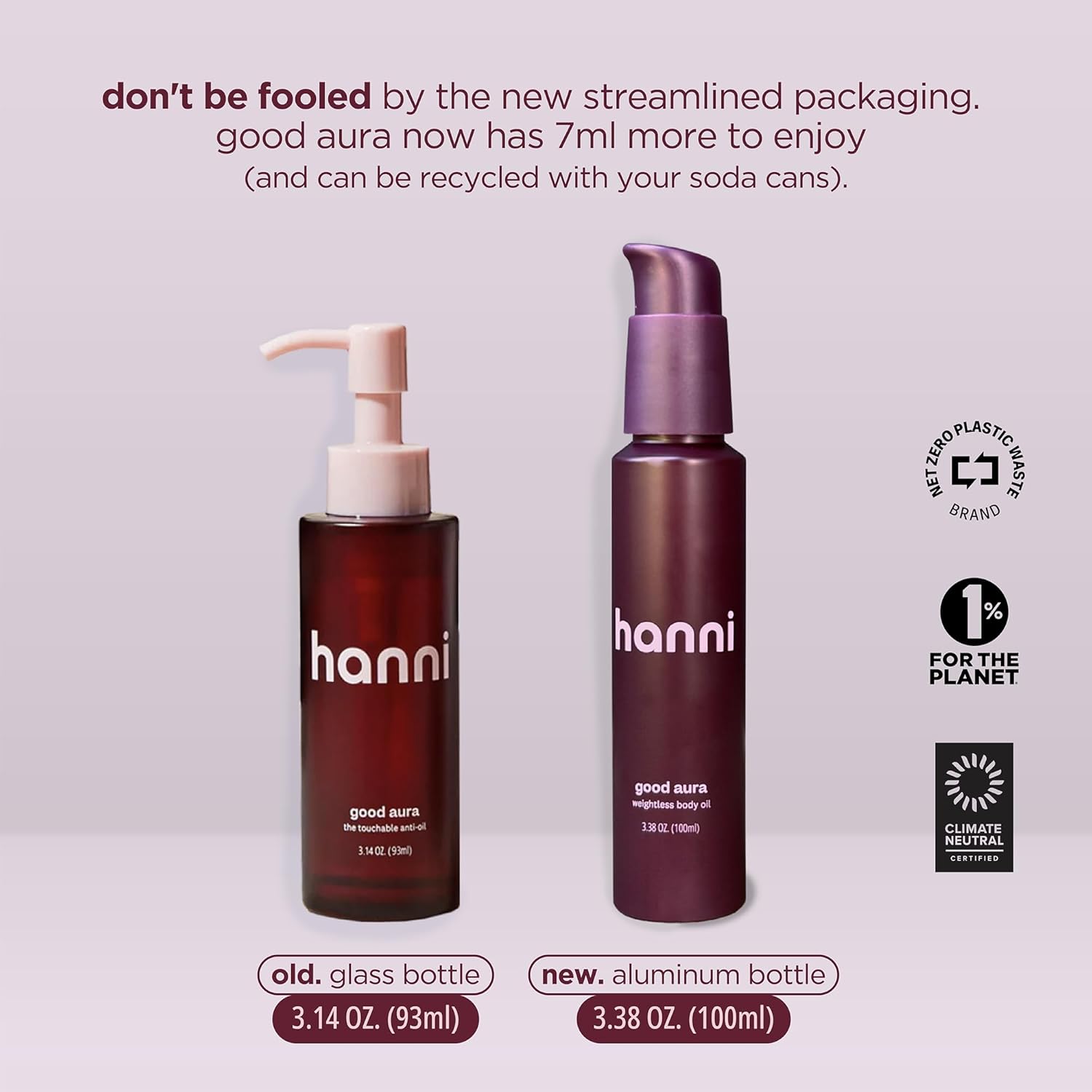 Hanni Good Aura Dry Body Oil After Shower, Body Moisturizer, Jojoba Oil & Coconut, Baobab, Buriti Fruit Oils For Skin Care, Light, Weightless, Moisturizing, Non-Greasy Skincare For Soft Skin, 3.38 Oz