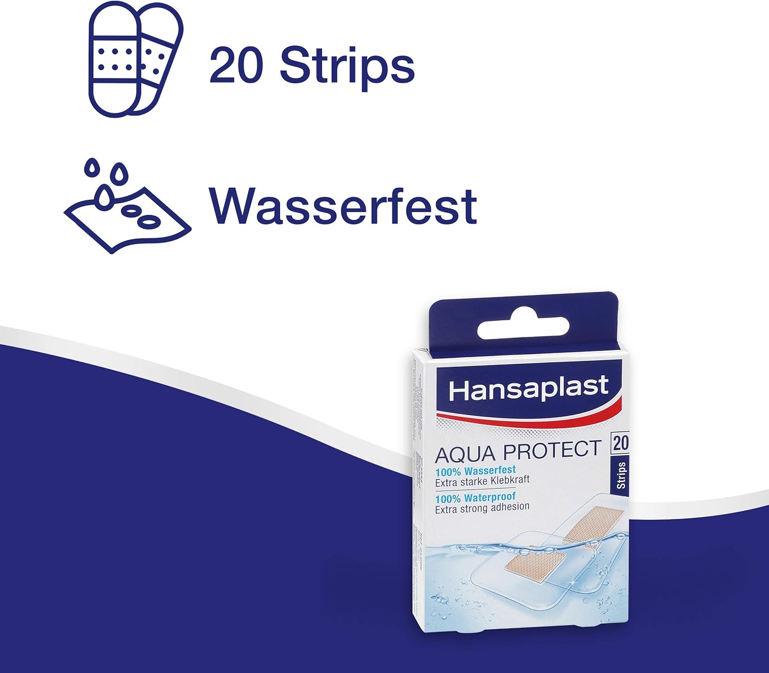 About this item 100% Waterproof - With the waterproof material, all types of minor wounds and injuries are reliably protected even when in contact with water. Ideal protection - The Hansaplast plasters reliably keep the wound dry when washing, showering and bathing and complement any dressing material. STRONG ADHESIVE - Thanks to extra strong adhesion, the waterproof plasters hold securely and do not slip. In addition, the wound dressing is particularly cuddly. Optimal wound care - The plasters cushion the injury with a non-adhesive wound dressing so that it is protected and can heal undisturbed. Practical package - Hansaplast Aqua Protect waterproof plaster, plaster set with extra strong adhesive strength suitable for showering and swimming, 1 x 20 strips. › See more product details,100% Waterproof - With the waterproof material, all types of minor wounds and injuries are reliably protected even when in contact with water,Ideal protection - The Hansaplast plasters reliably keep the wound dry when washing, showering and bathing and complement any dressing material,STRONG ADHESIVE - Thanks to extra strong adhesion, the waterproof plasters hold securely and do not slip. In addition, the wound dressing is particularly cuddly,Optimal wound care - The plasters cushion the injury with a non-adhesive wound dressing so that it is protected and can heal undisturbed,Practical package - Hansaplast Aqua Protect waterproof plaster, plaster set with extra strong adhesive strength suitable for showering and swimming, 1 x 20 strips