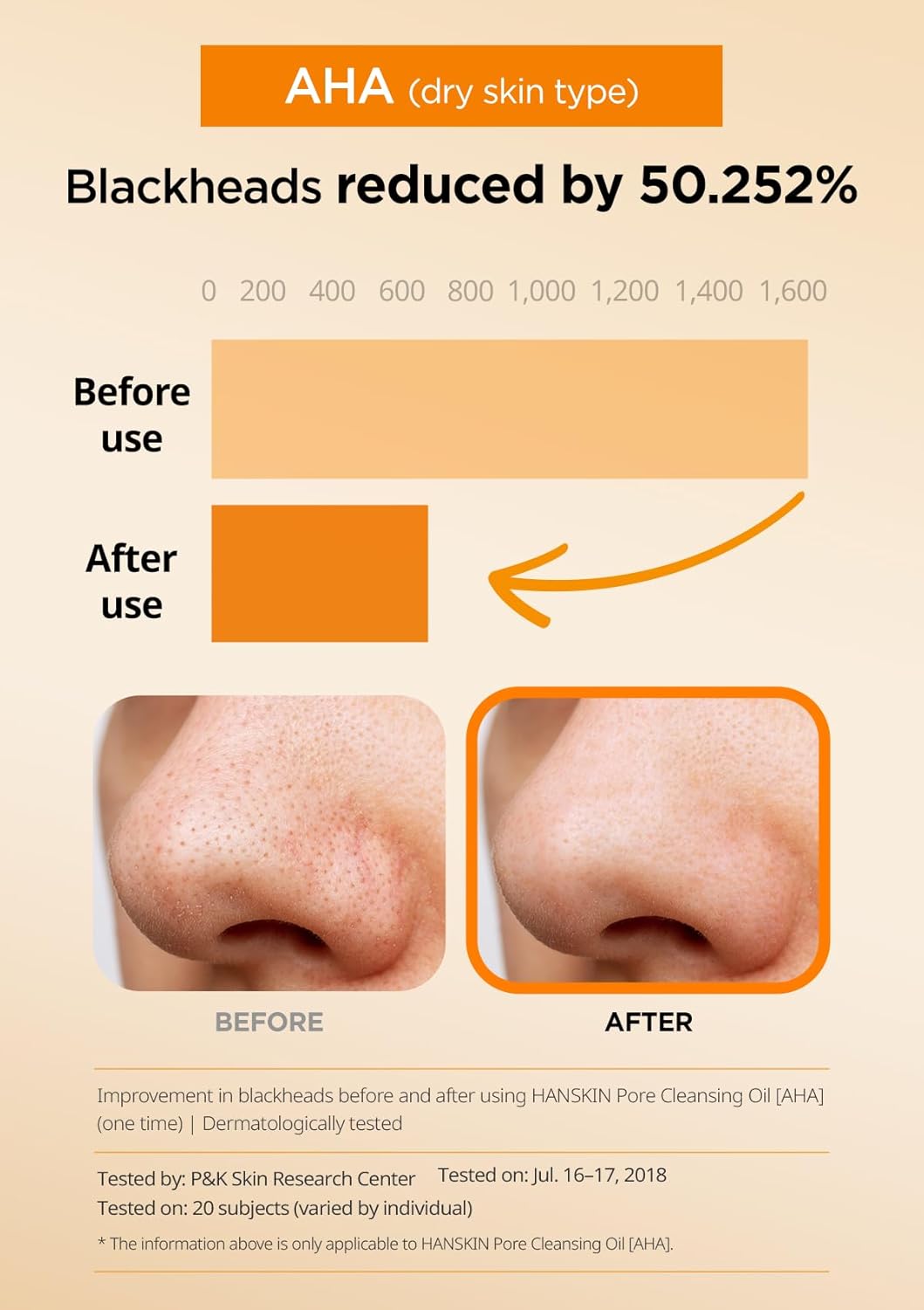 Waterproof Makeup Remover & Non- eye irritation: Effortlessly dissolve even the most stubborn waterproof makeup without causing eye irritation. Hanskinās gentle AHA Pore Cleansing Oil purifies pores while being kind to your eyes, leaving your skin clean, refreshed, and balanced