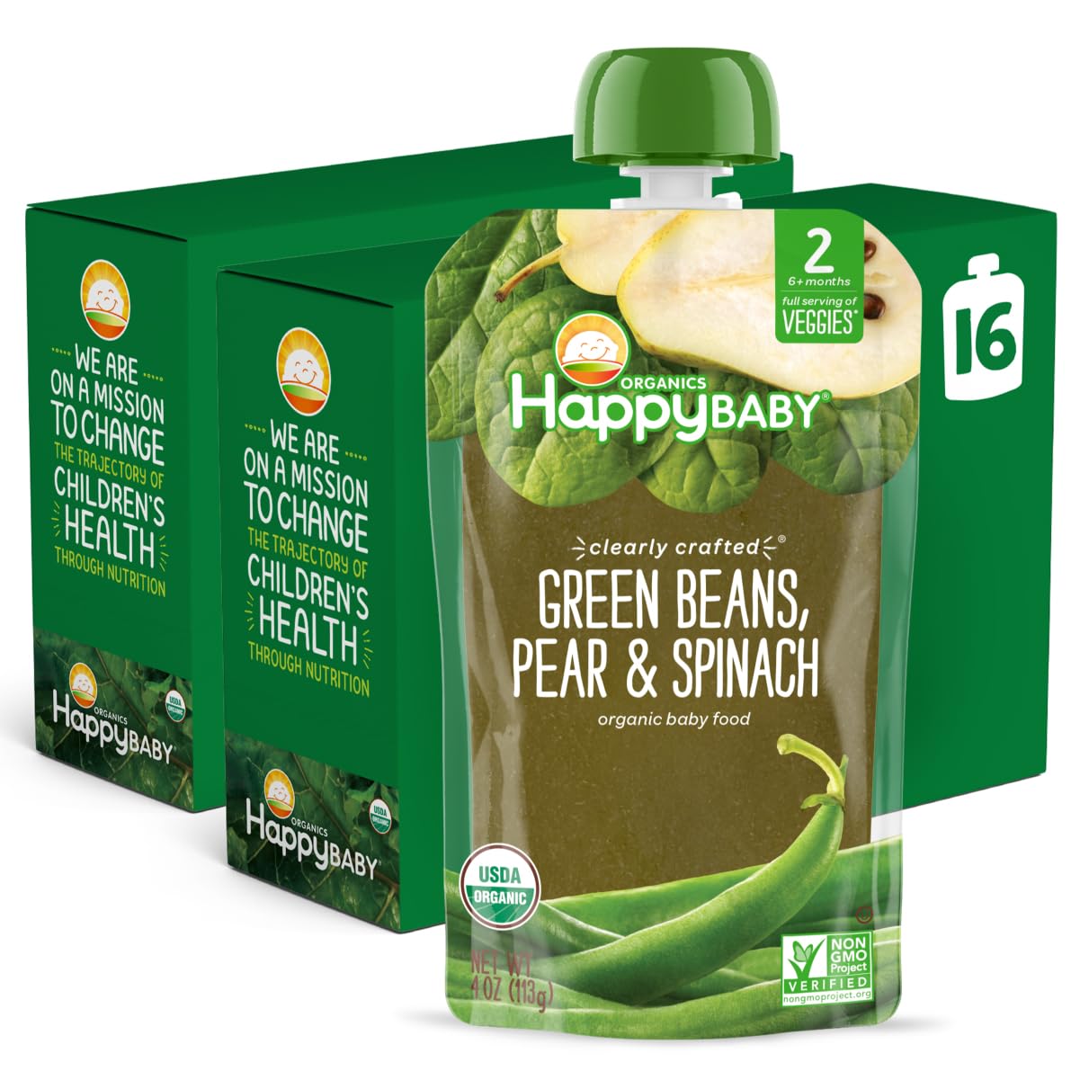 Happy Baby Organics Stage 2 Baby Food Pouches, Gluten Free, Vegan & Healthy Snack, Clearly Crafted Fruit & Veggie Puree, Green Beans, Pears & Spinach, 4 Ounces (Pack Of 16)