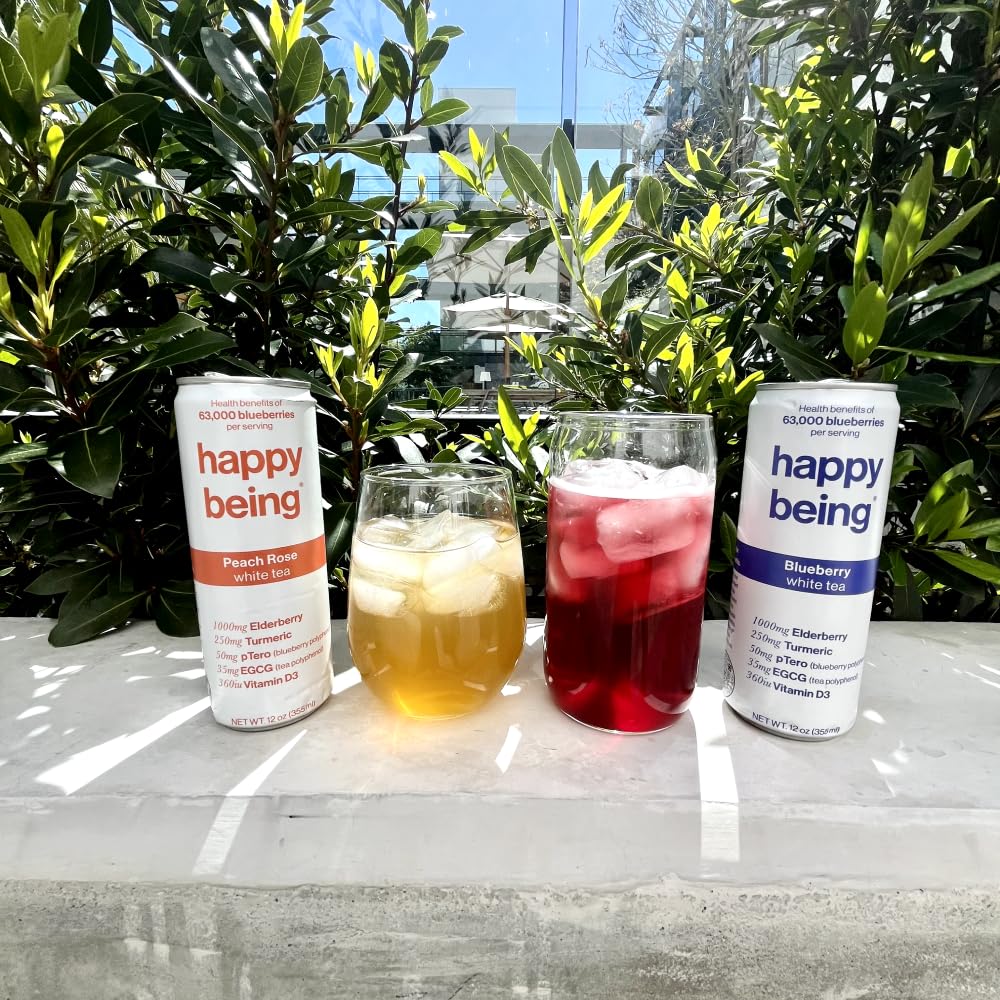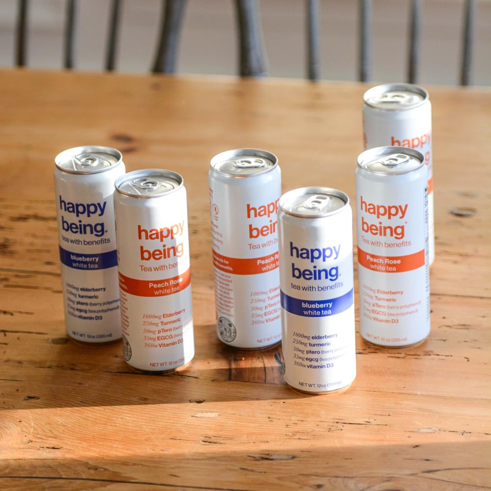 Happy Being Nutrient-Rich Organic Blueberry & Peach Rose White Tea – Infused With Turmeric, Elderberry, Vitamin D3, Caffeine Free, Plant-Based, Low Calorie & Low Sugar Drinks, Variety Pack (16 Pack)