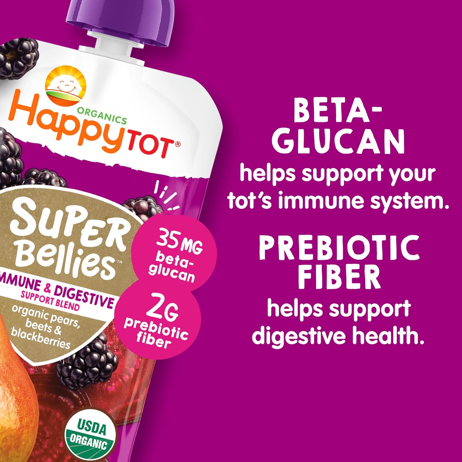 SUPER BELLIES SUPPORT BLEND: Each Super Bellies organic pouch contains 35mg of beta-glucan and 2g of prebiotic Fiber to help support digestive health for your growing (and sometimes picky) eater10FOR STAGE 4 EATERS: Got a picky eater. You're not alone. Stage 4 pouches feature fiber, protein, veggies, superfoods & more. We’re here with trusted, organic snacks & meals for your little one’s budding palate10HAPPY TOT: Our trusted, organic toddler pouches, snacks and mealtime solutions offer nutrition your little one needs - like fiber, protein, veggies and more – in flavors even picky eaters will love10HAPPY FAMILY ORGANICS: We are on a mission to change the trajectory of children's health through nutrition; We provide age and stage appropriate premium organic food products for baby, tot, kid, and mama10OUR HAPPY PROMISE: All products are certified USDA organic, made with non-GMO ingredients grown without the use of toxic persistent pesticides and in packaging made without BPA, BPS, or phthalates