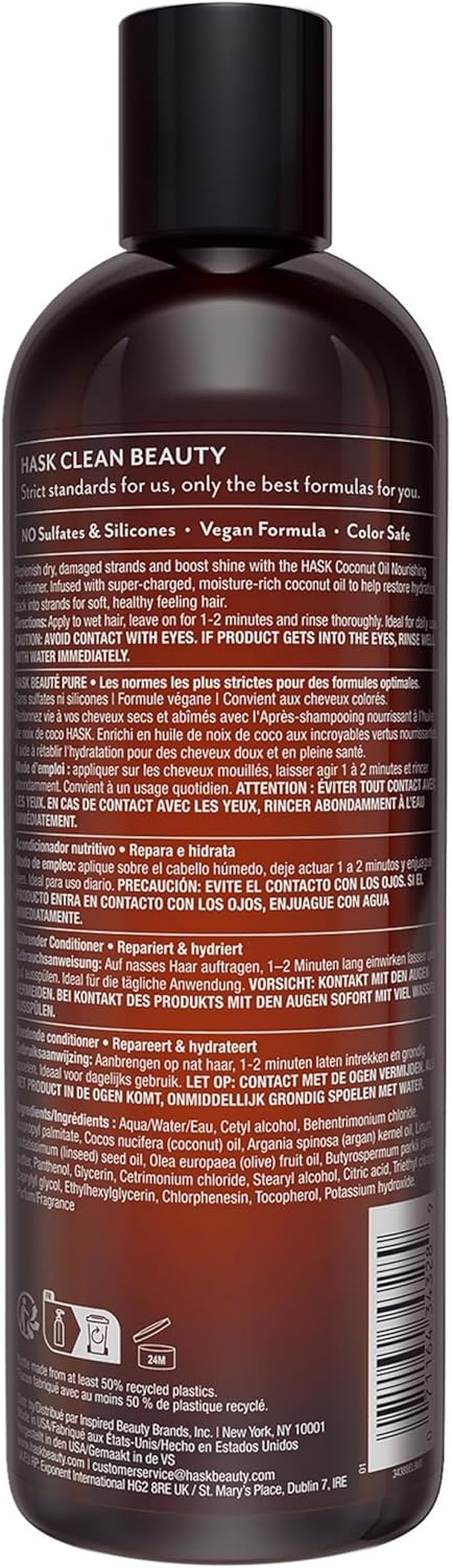 Product Description Moisturizes and Revitalizes Free of: sulfates, parabens, phthalates, gluten, drying alcohol and artificial colors. Give your hair a tropical vacation with HASK Coconut Oil Nourishing Conditioner infused with Tahitian monoi oil. This softening blend helps protect against damage by hydrating and detangling for shiny, smooth strands. Ingredients Aqua/Water/Eau, Cetyl alcohol, Behentrimonium chloride, Glycerin, Isopropyl palmitate, Gardenia taitensis (monoi) flower extract, Cocos nucifera (coconut) oil, Argania spinosa (argan) kernel oil, Linum usitatissimum (linseed) seed oil, Vaccinium myrtillus (bilberry) fruit extract, Olea europaea (olive) fruit oil, Butyrospermum parkii (shea) butter, Panthenol, Dimethicone, Phenoxyethanol, Cetrimonium chloride, Stearyl alcohol, Citric acid, Triethyl citrate, Parfum/Fragrance P.when('A').execute(function(A) { A.on('a:expander:toggle_description:toggle:collapse', function(data) { window.scroll(0, data.expander.$expander[0].offsetTop-100); }); }); Directions Apply to wet hair after shampooing, leave in for a short period, then rinse out completely. Safety Warning Caution: avoid contact with eyes. If product gets into the eyes, rinse well with water immediately. See more,Kit Includes | 1 Conditioner to refresh and revitalize,Nourishing Formula | Our conditioner restores moisture, softens and detangles,Our Hero | Infused with coconut, the tropical escape your hair has been waiting for,Silky soft locks | Easy to manage and radiantly renewed,Free of | Sulfates, parabens, phthalates, gluten and drying alcohol