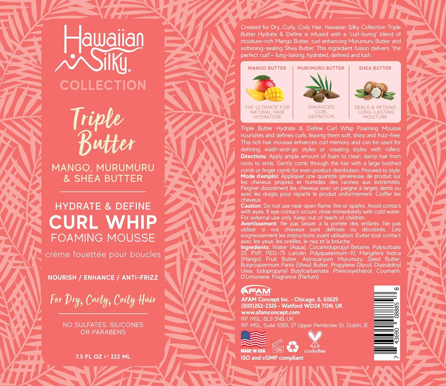 TRIPLE BUTTER CURL WHIP FOAMING MOUSSE nourished and defines curls, leaving them soft, shiny and frizz-freeHAWAIIAN SILKY MURUMURU BUTTER HAIR MOUSSE enhances curl memory and can be used for defining wash-and-go styles or creating styles with rollersCreated for Dry, Curly, Coily Hair, Hawaiian Silky Collection Triple Butter Hydrate & Define is infused with a "Curl-Loving" blend of moisture-rich Mango Butter, curl enhancing Murumuru Butter and Softening-sealing Shea Butter. This ingredient fusion delivers "the perfect curl" - long-lasting, hydrated, defined and lushDAILY USE encourages lots of added bounce and softness while repairing all dry or damaged hair, leave it with a radiant shineNEVER TESTED ON ANIMALS - It is our pledge to never test our products on animals. A 30 Day return Guarantee - If you donāt LOVE our Hair Care Solution then we will refund your money NO QUESTIONS ASKED. Click āAdd to Cartā NowHawaiian Silky Triple Butter Curl Whip Foaming Mousse, 7.5 fl oz with Mango, Murumuru & Shea Butter's for Nourish, Enhance & Anti-Frizz Styling | No Sulfate, Silicones or Parabens