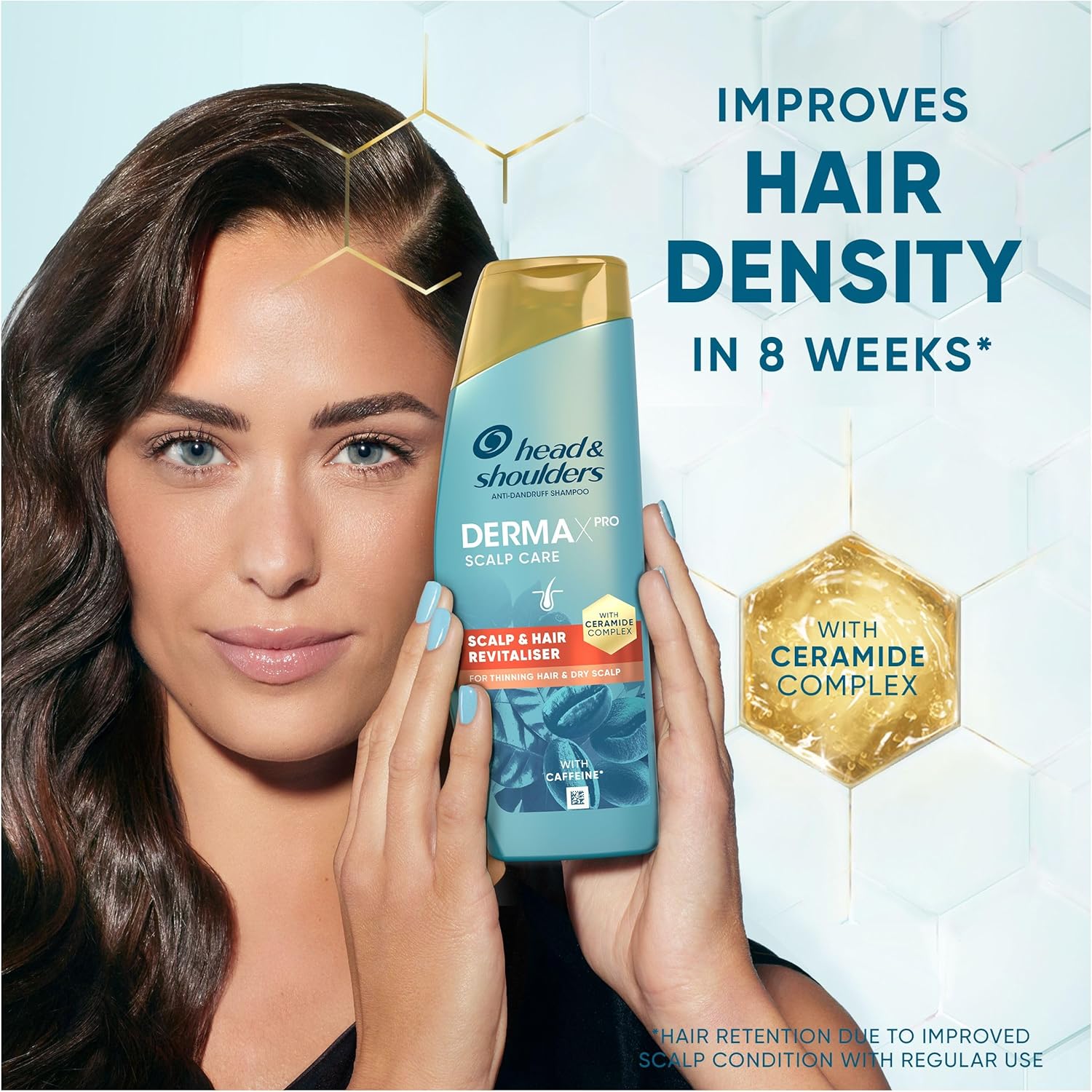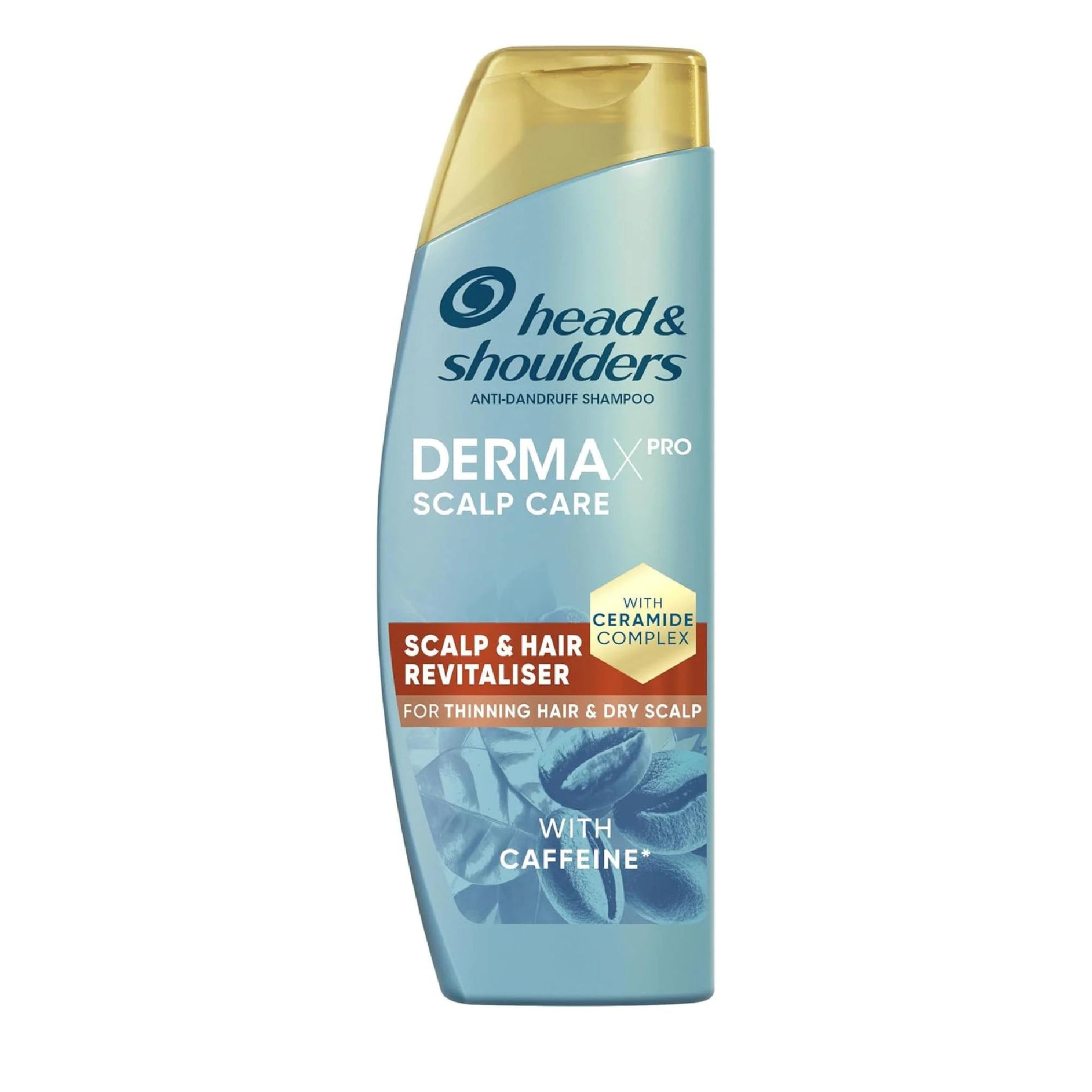 Product Description Did you know that your dry, flaky scalp needs more than just moisture Head & Shoulders DermaXPro Hair and Scalp Revitaliser Anti-Dandruff Shampoo helps reinforce your natural skin barrier and restores your scalpās natural balance, while helping to prevent hair fall. Our expert formula is powered by ceramide complex that mimics the natural lipid found in skin, that holds cells together to prevent moisture loss. Designed especially for thinning hair prone to falling, our shampoo works with your scalp to help repair skin dryness. It helps improve hair density in 8 weeks, saving up to 3,500 more hairs, thanks to improved hair retention. Itās enriched with caffeine* and powered by a clinically proven ingredient, piroctone olamine. The result A moisturised, flake-free** scalp that helps to promote the conditions for healthy hair growth. (*Synthetic caffeine **Visible flakes, with regular use) Ingredients Aqua, Sodium Laureth Sulfate, Sodium Lauryl Sulfate, Sodium Chloride, Cocamidopropyl Betaine, Sodium Xylenesulfonate, Glycol Distearate, Sodium Citrate, Dimethiconol, Piroctone Olamine, Dimethicone, Parfum, Citric Acid, Sodium Benzoate, Sodium Salicylate, TEA-Dodecylbenzenesulfonate, Guar Hydroxypropyltrimonium Chloride, Menthol, Tocopheryl Acetate, Trideceth-10, Tetrasodium EDTA, Sodium Hydroxide, Hexyl Cinnamal, Niacinamide, Aloe Barbadensis Leaf Juice, Linalool, Hydroxycitronellal, Geraniol, Citronellol, Benzyl Alcohol, Triethylene Glycol, Propylene Glycol P.when('A').execute(function(A) { A.on('a:expander:toggle_description:toggle:collapse', function(data) { window.scroll(0, data.expander.$expander[0].offsetTop-100); }); }); Directions Apply Head & Shoulders DermaXPro Revitaliser Anti Dandruff Shampoo to wet hair. Lather into the scalp and massage gently. Leave on for a few minutes to maximize dandruff protection. Rinse thoroughly. Safety Warning Avoid contact with eyes. If contact occurs, rinse thoroughly with water. Manufacturer Contact Information Procter & Gamble UK, Weybridge, Surrey, KT13 0XP See more,REVITALISING ANTI-DANDRUFF SHAMPOO. Moisturises the scalp and prevents hair fall due to breakage. With regular use, works on the scalpās surface to help restore ceramide levels and repair skin dryness,INFUSED WITH CAFFEINE* & CERAMIDE COMPLEX. Designed to care for hair prone to falling, our expert formula is infused with caffeine*, piroctone olamine and ceramide. (*synthetic caffeine),CLINICALLY PROVEN SCALP CARE. Our DermaXPro Revitaliser Anti-Dandruff Shampoo is clinically proven to help restore skin ceramides and retain the hair you have for longer thanks to improved scalp condition,TARGETED DANDRUFF PROTECTION. Tackle the root cause of dandruff with a hair fall shampoo that does more than just cleanse. It moisturises skin, and it replenishes it, helping to fend off flakes and strengthen hair against breakage,DERMATOLOGICALLY TESTED. This DermaXPro expert scalp care shampoo is gentle for your scalp & hair