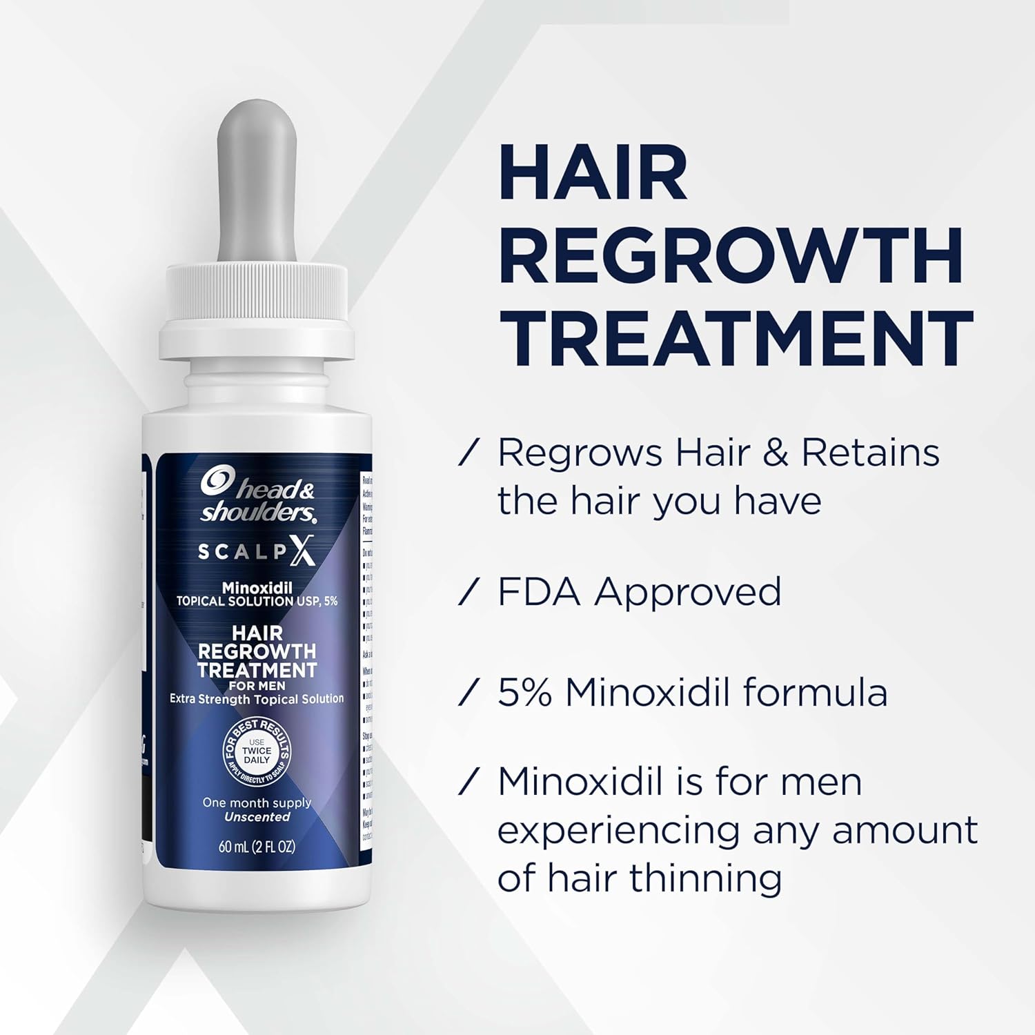 Introducing New Head & Shoulders Scalp X Hair Regrowth Treatment For Men, Brought To You By AmericaāS #1 Dermatologist Recommended Brand. Healthy Hair Starts With A Healthy Scalp. Clinically Proven To Help Regrow Hair Where Thinning Or Balding Has Occurred, Our Scalp X Hair Regrowth Treatment For Men Is A Twice A Day Leave-On Treatment Designed To Revitalize Hair Follicles And Stimulate Regrowth. Made With The Same Active Ingredient As RogaineāMinoxidil, The #1 Dermatologist Recommended Active Ingredient- This Hair Regrowth Treatment Helps You Regrow Hair At The Top Of The Scalp. Try Pairing With Head & Shoulders Scalp X Anti-Dandruff Shampoo To Retain The Hair You Have* And Regrow The Hair You Want.** For Hair Loss At The Top Of The Scalp *Reduce Hair Loss Due To Breakage With Shampoo & Conditioner **Regrow Hair At The Top Of The Scalp With Minoxidil Treatment
