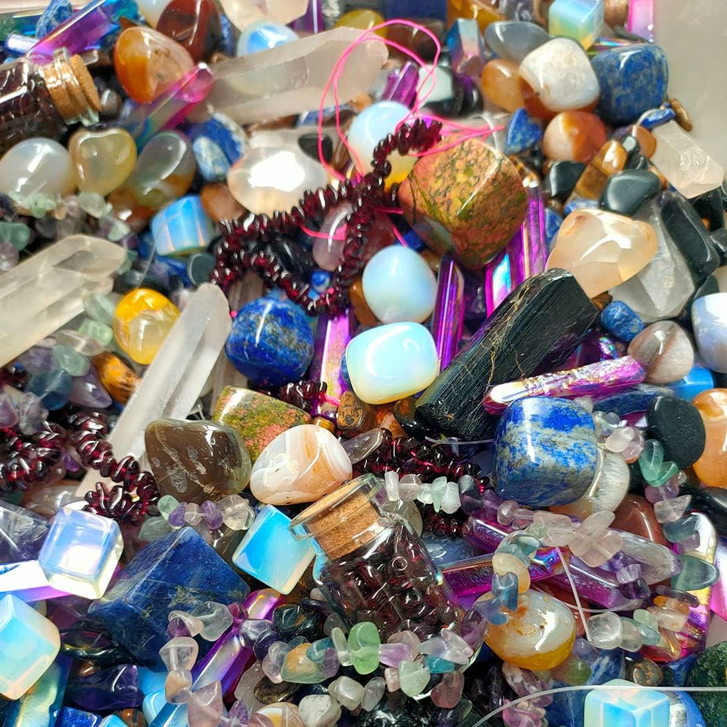 Beautiful mixed bags full of various stones! You can expect to see Tumble Stones, Rough Gemstones, Crystal Points, Hearts, Cluster, Chips with Holes, or special gifts, each scoop is truly unique!