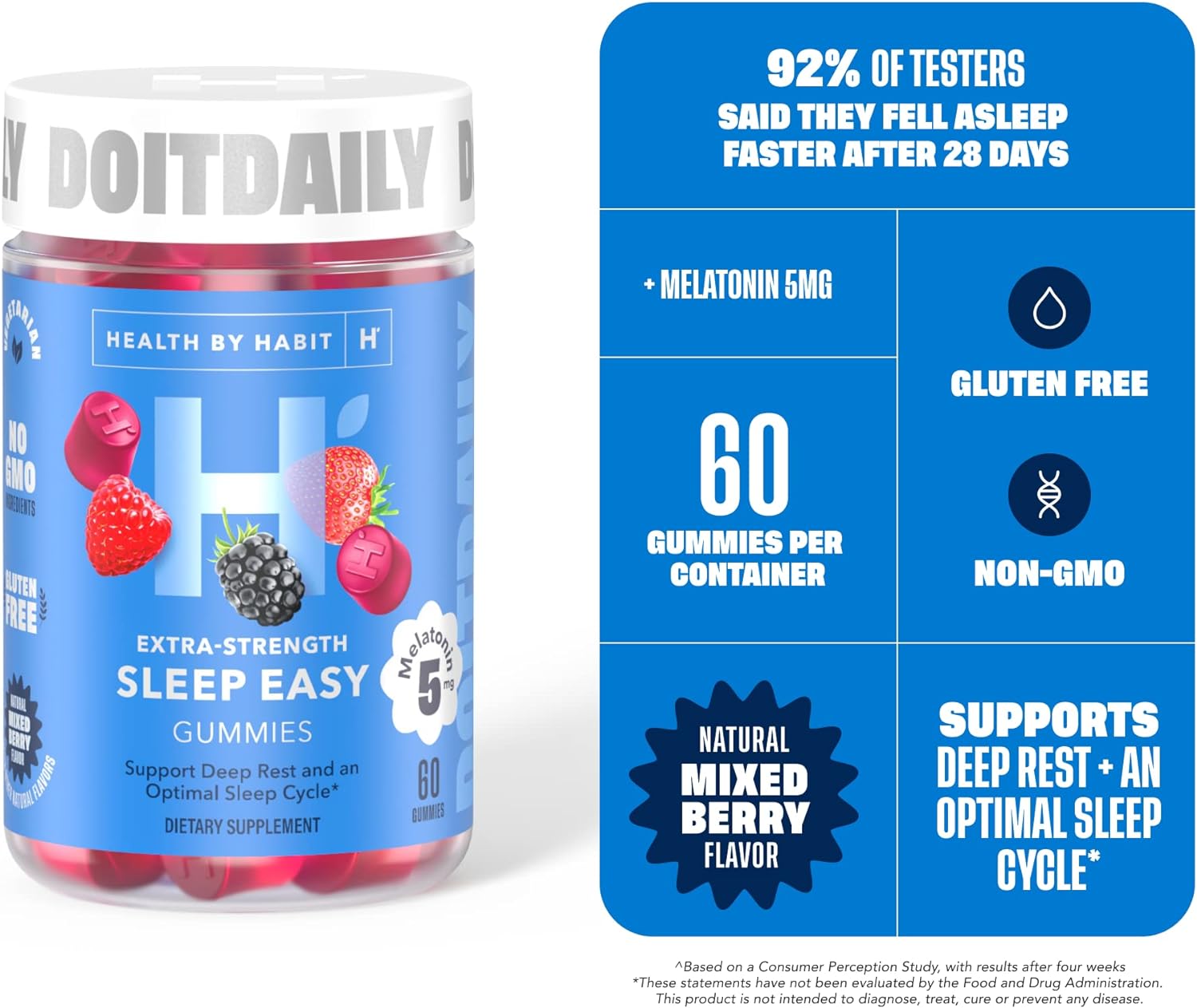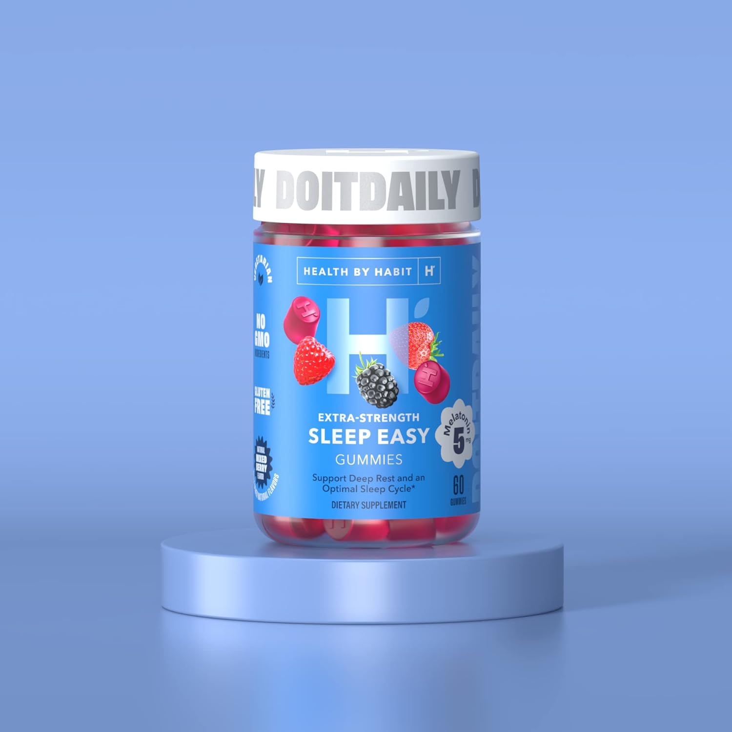 SLEEP EASY: With the power of 5 mg of Melatonin, these berry-?avored gummies will help you fall asleep faster, sleep longer and betterāand can even help with fatigue and jet lag!āfor your best rest ever. Sweet dreams are made of theseWHATāS INSIDE: Powered by 5mg Melatonin per servingHOW THEY WORK: To support deep rest and an optimal sleep cycle, we suggest taking 2 gummies 20-30 minutes before bedtimeWHY YOUāLL LOVE: These delicious vegetarian and gluten-free gummies come in a natural berry flavor, and are free from allergens, GMO ingredients, synthetic colours and artificial flavours. Theyāre also made in the USADO IT DAILY: At Health By Habit, we like to keep things simple. We make vitamins that are affordable, fun to take, easy to remember to takeāand most importantly, that work!āso that you can get on with doing the more exciting things in lifeWith the power of 5mg of Melatonin per serve, our Extra-Strength Sleep Easy Gummies work to support deep rest and an optimal sleep cycle. These naturally flavored sleep support supplements are designed to help you fall asleep faster, sleep longer and betterāand can even help with fatigue and jet lag!āfor your best rest ever.* These delicious vegetarian and gluten-free chewable gummies come in a natural mixed berry flavor, and are free from allergens, GMO ingredients, synthetic colors and artificial flavors. At Health By Habit, we like to keep things simple. We make daily supplements that are affordable, fun to take, easy to remember to takeāand most importantly, that work!āso that you can get on with doing the more exciting things in life. *These statements have not been evaluated by the Food and Drug Administration. This product is not intended to diagnose, treat, cure or prevent any disease