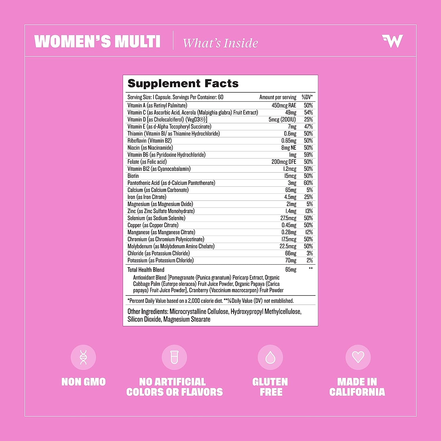 WOMEN'S MULTI: Support your health with 23 essential vitamins and minerals, all in one convenient capsuleTHE MULTIS: These Multivitamins are our multi-taskers. Much like you, they do way more than one thing at a time, with the essential vitamins and minerals you need to feel like your best selfTHE POWER OF HABIT: At Health By Habit we know maintaining your health is hard enough, so we donât overcomplicate it. Weâre democratizing wellness by making products that are affordable, accessible and straight-forward. That do what they say on the labelFORMULATED BY EXPERTS: Created by our expert research and development team â who have decades of experience between them â our clever formulations leverage active ingredients at the intersection of holistic and traditional medicines. The result? Solutions that support your desired wellness outcomesMAKING IT A HABIT: Health By Habit vitamins are housed in fun, color-coded bottles youâll want to show off (rather than stash away out of sight and forget about). Routine doesnât have to be boring â and neither does taking your vitaminsNot all heroes wear capes, in fact many wear activewear. Thatâs why we designed our Womenâs Multivitamin to support your general health and wellness with 23 essential vitamins and mineralsâsuch as Vitamins A-E, Calcium, Folate, Iron and Zincâin one convenient capsule. With the addition of a Total Health Blend containing antioxidant Cranberry, Acai, Pomegranate and Papaya, it does (almost) as many things as you do in a day