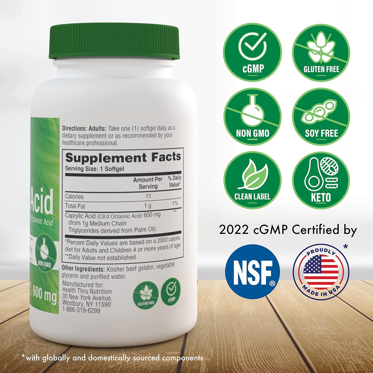 Health Thru Nutrition Caprylic Acid 600Mg C8 Octanoic Acid From Pure 1G Mct Oil | Non-Gmo & Soy Free | Support Healthy Digestive And Intestinal Health | Keto Friendly