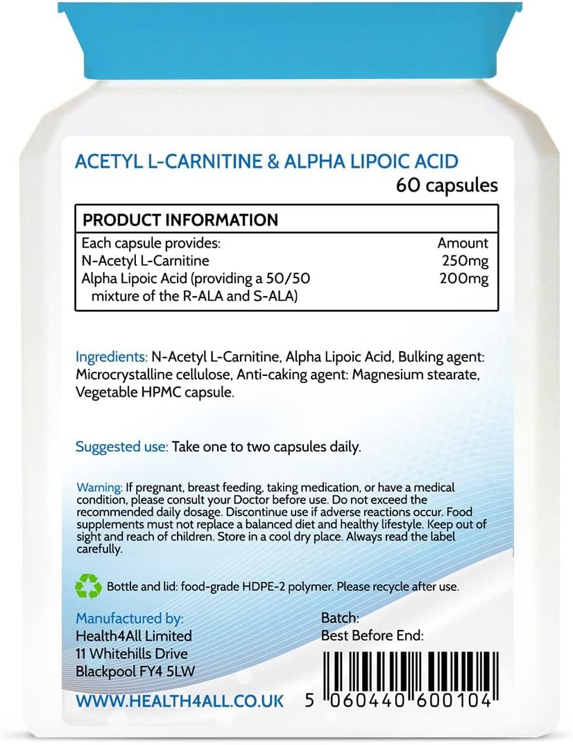 Health4All Acetyl L-Carnitine 250Mg & Alpha Lipoic Acid 200Mg 60 Capsules, Vegan Alcar & Ala Supplement For Brain Health, Memory, Focus And Mental Clarity | Made In Uk