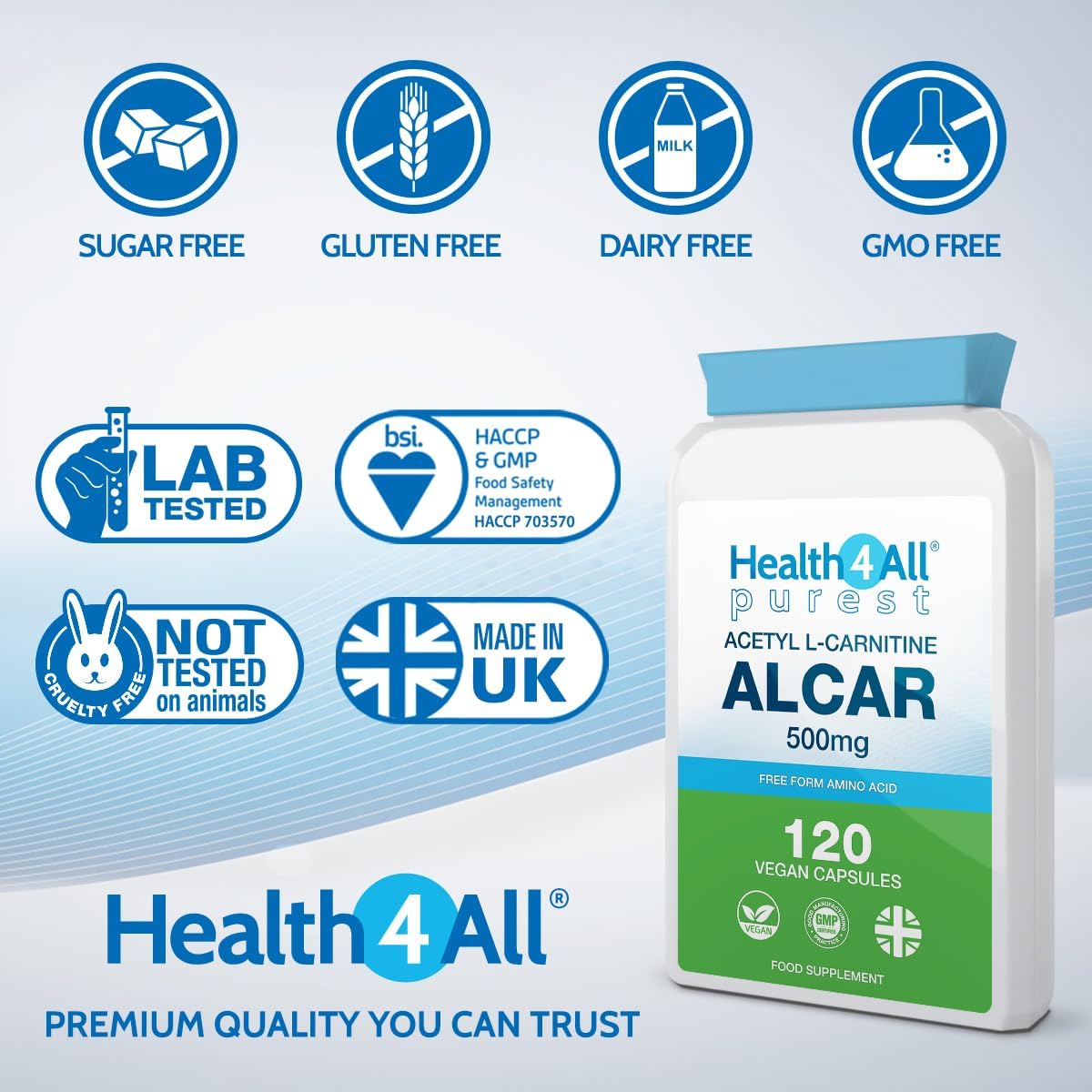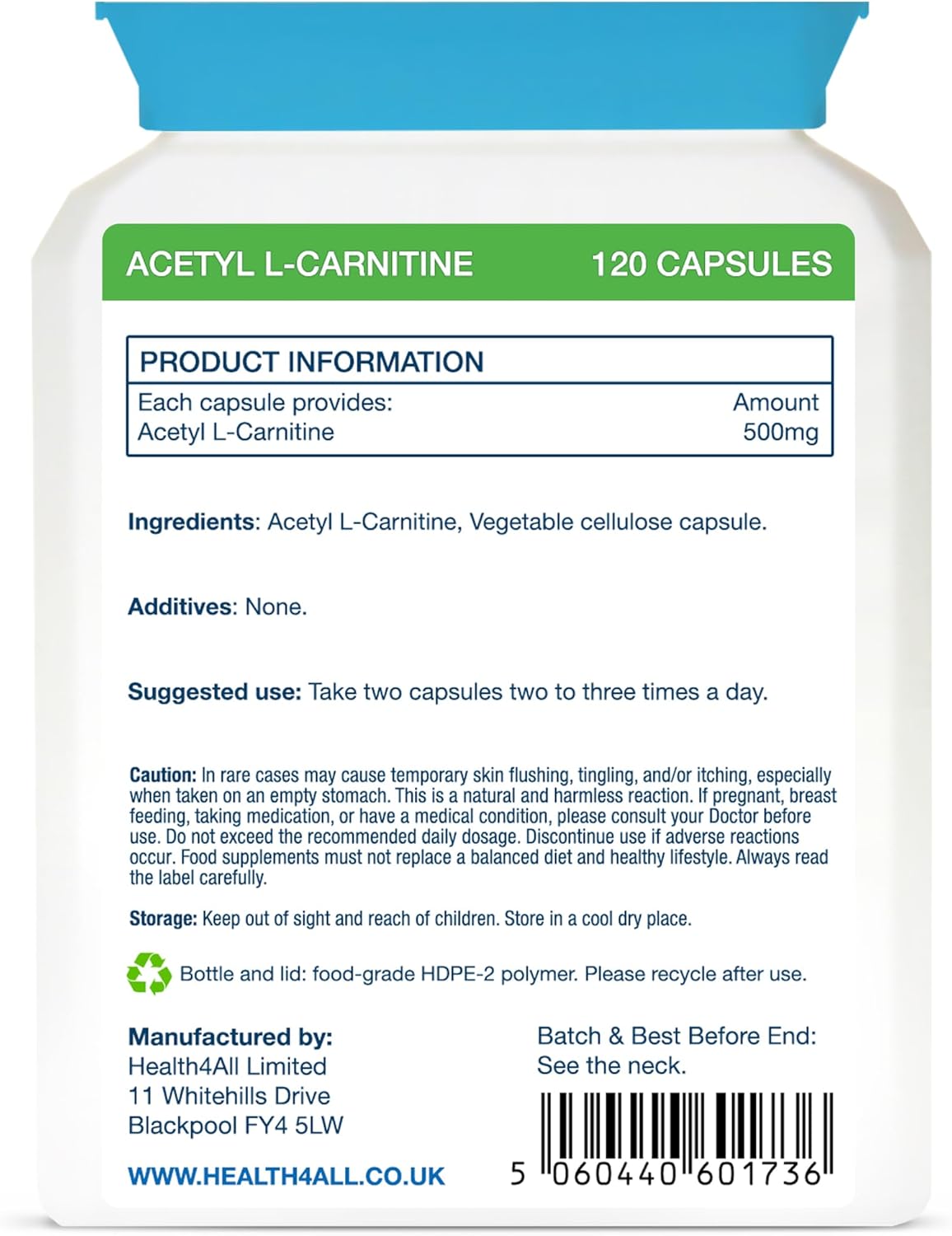 Health4All Acetyl L-Carnitine 500Mg 120 Capsules, Purest High Strength Alcar Amino Acid With No D-Carnitine, Vegan, Gluten-Free, Gmo-Free Acetyl-L-Carnitine Supplement | Made In Uk