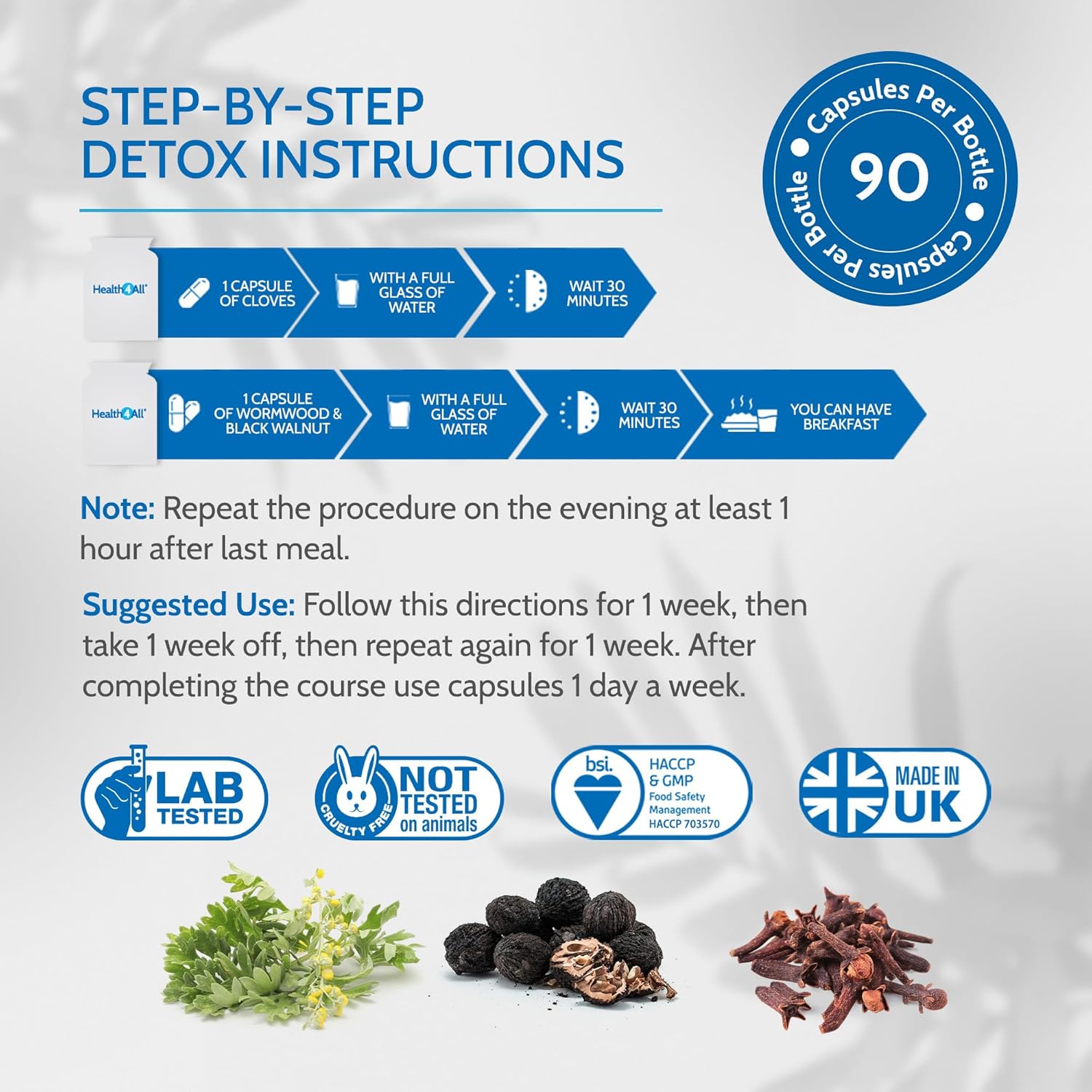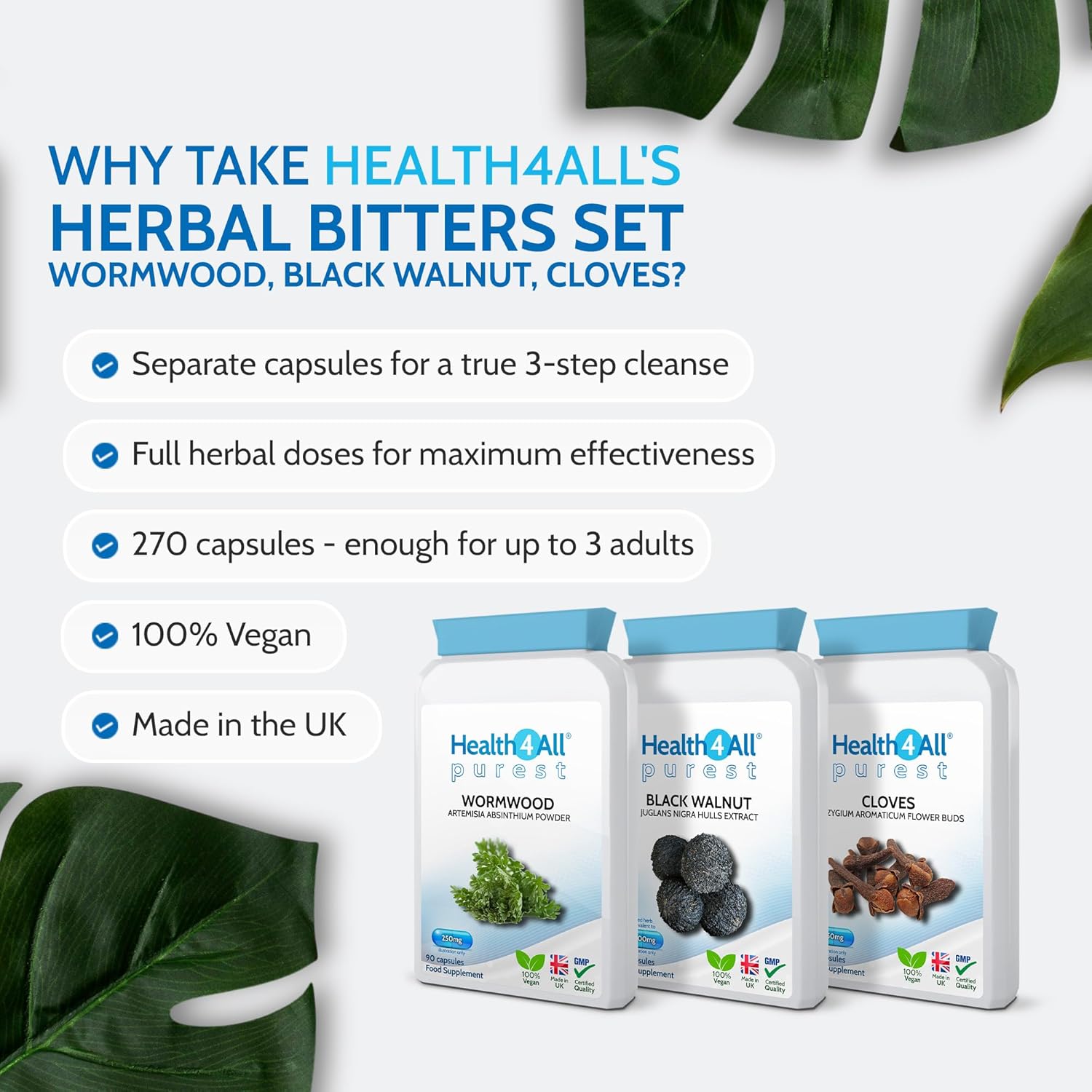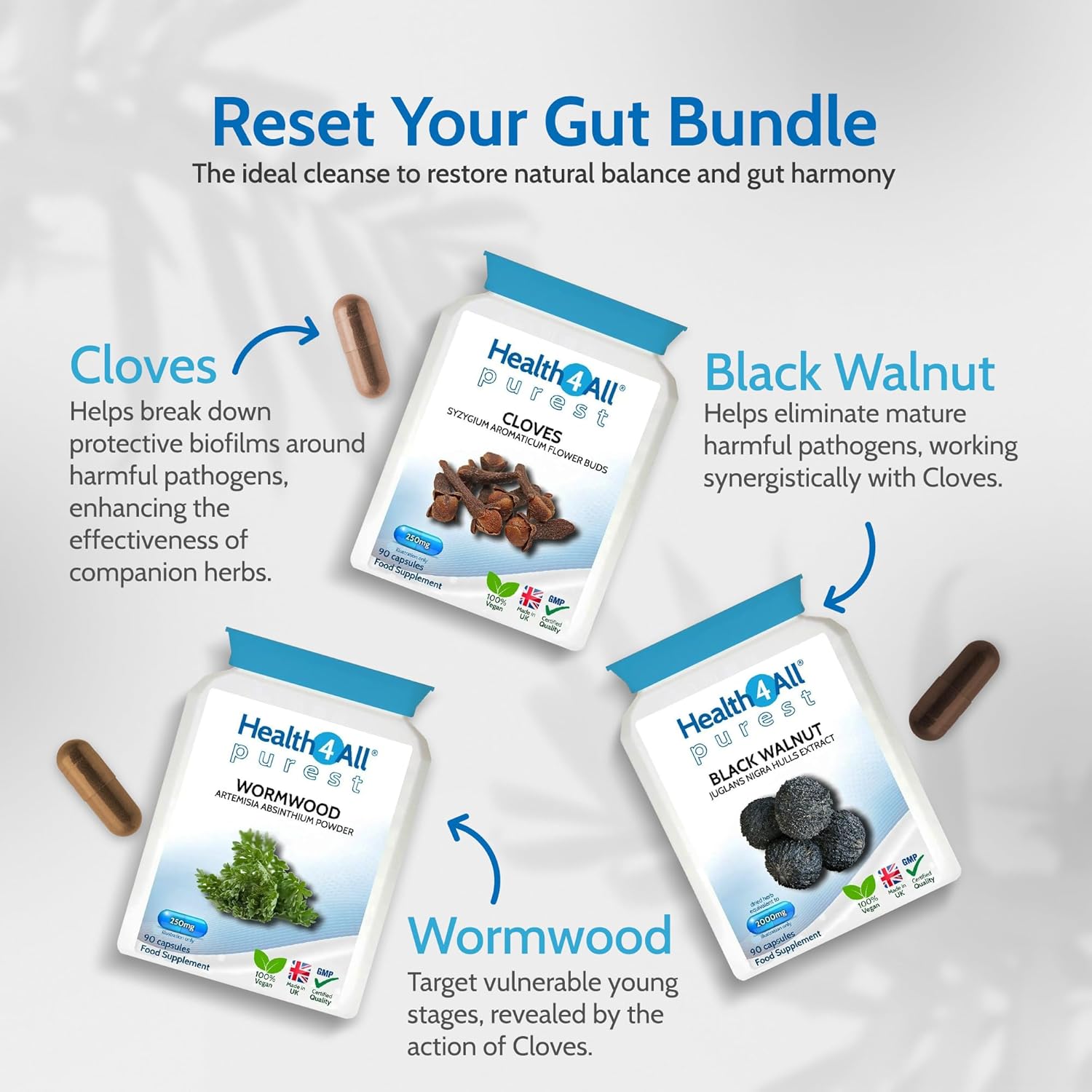 Health4All Wormwood, Black Walnut, Cloves Digestive Intestinal Detox Cleanse For Humans Set, 3X90 270 Capsules, 3 Step Gut Cleanse & Repair, Purest Vegan Intestinal Detox Supplement | Made In Uk