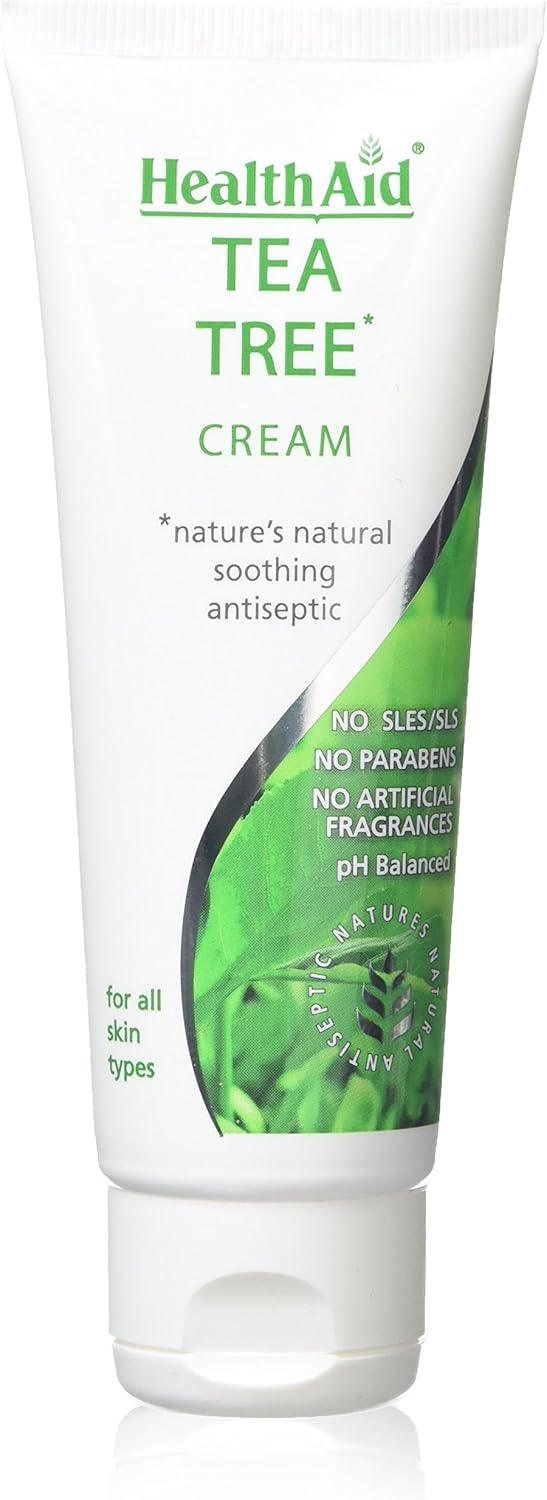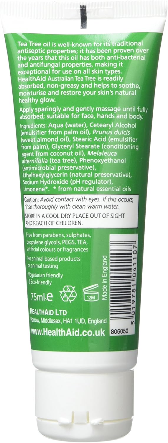 Product Description Tea Tree oil has been proven over the years to have both anti-bacterial and antifungal properties. HealthAid has formulated this natural tea tree range using high quality Australian Tea Tree, which is readily absorbed, non-greasy and helps to soothe, moisturise and restore the skin’s natural healthy glow. Ingredients Aqua (water), Cetearyl Alcohol (emulsifier from palm oil), Prunus dulcis (sweet almond oil), Stearic Acid (emulsifier from palm), Glyceryl Stearate (conditioning agent from coconut oil), Melaleuca alternifolia (tea tree), Phenoxyethanol (antimicrobial preservative), Ethylhexylglycerin (natural preservative), Sodium Hydroxide (pH regulator), Limonene*. * From natural essential oils P.when('A').execute(function(A) { A.on('a:expander:toggle_description:toggle:collapse', function(data) { window.scroll(0, data.expander.$expander[0].offsetTop-100); }); }); Directions Apply sparingly to the appropriate area and gently massage until fully absorbed; suitable for the face, hands and body. Avoid contact with eyes. If this occurs, rinse thoroughly with clean warm water. For external use ONLY. Safety Warning Avoid contact with eyes. If this occurs, rinse thoroughly with clean warm water. For external use ONLY. Legal Disclaimer Use product according to directions stated on the pack. Food supplements should not be used as a substitute for a varied diet. Please check with your primary healthcare physician before taking this supplement if you suffer from a medical condition, are on prescribed medication, are pregnant or breastfeeding or suffer from food allergies. Food supplements are not intended to treat or prevent any disease. Do not use after the expiry date. Box Contains 75ml Cream See more,Beneficial for people who have very dry skin,May be beneficial for people who experience itchy skin,May help teenagers with skin conditions,Vegetarian friendly & Eco-friendly,ree from parabens, sulphates, propylene glycols, PEGS, TEA