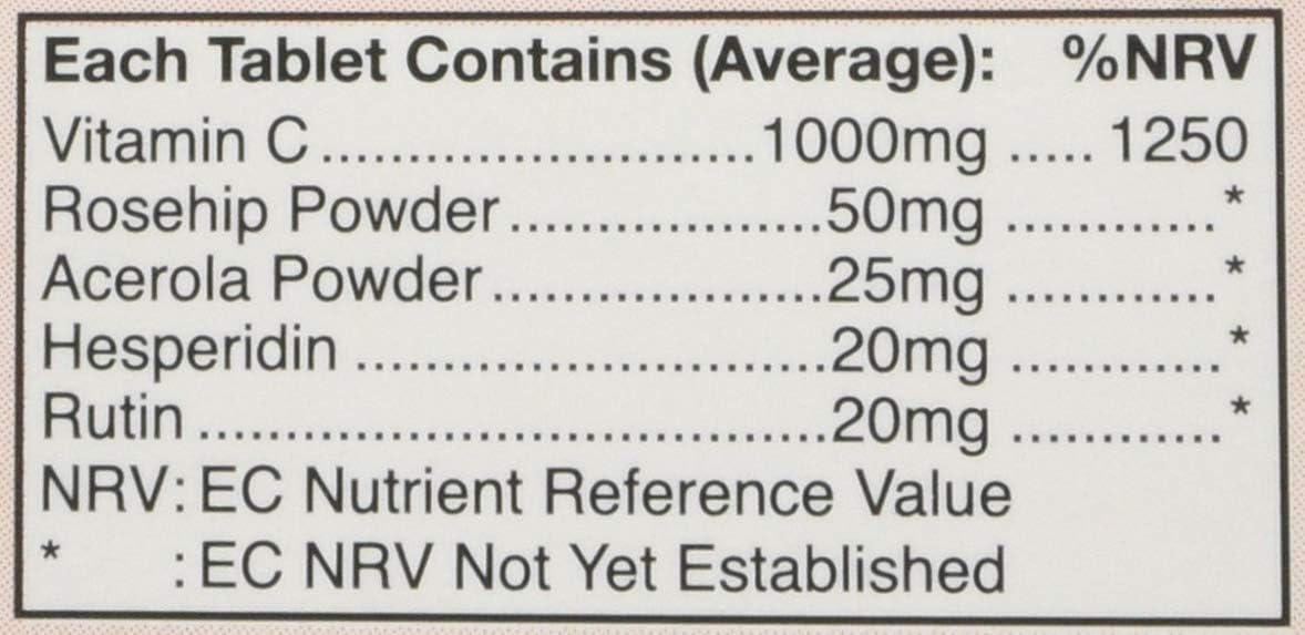Product Description Veg. Stearic Acid, Flavour (orange neorome), Sweetener (sodium saccharin), Colour (sunset yellow lake). Vitamin C (ascorbic acid, sodium ascorbate), Lactose Dextrose Granules, Xylitab, Rosehip Powder, Acerola Powder, Veg. Magnesium Stearate, Veg. Stearic Acid, Flavour (orange neorome), Sweetener (sodium saccharin), Colour (sunset yellow lake). Ingredients Vitamin C (ascorbic acid, HPMC), Bulking Agent [hydroxy propyl methyl cellulose (HPMC), microcrystalline cellulose], Anti-caking Agent (silica, veg. magnesium stearate), Rosehip Powder (Rosa canina), Emulsifier (crosscarmellose sodium), Glazing Agent (SCMC, dextrin, dextrose, SOY LECITHIN, sodium citrate), Acerola Berry Powder (Malpighia punicifolia), Hesperidin (Citrus sinensis), Rutin Bean Extract (Dimorphandra mollis). P.when('A').execute(function(A) { A.on('a:expander:toggle_description:toggle:collapse', function(data) { window.scroll(0, data.expander.$expander[0].offsetTop-100); }); }); Safety Warning Excessive doses may lead to gastrointestinal disturbances such as flatulence or diarrhoea, reduce dosage to tolerance levels. See more,Contributes to normal collagen formation which is important for normal function of blood vessels, cartilage, bones, skin, gums and teeth,Contributes to normal energy-yielding metabolism and function of the nervous system,Contributes to normal psychological function,Beneficial for normal function of the immune system,Helps protect cells from oxidative stress