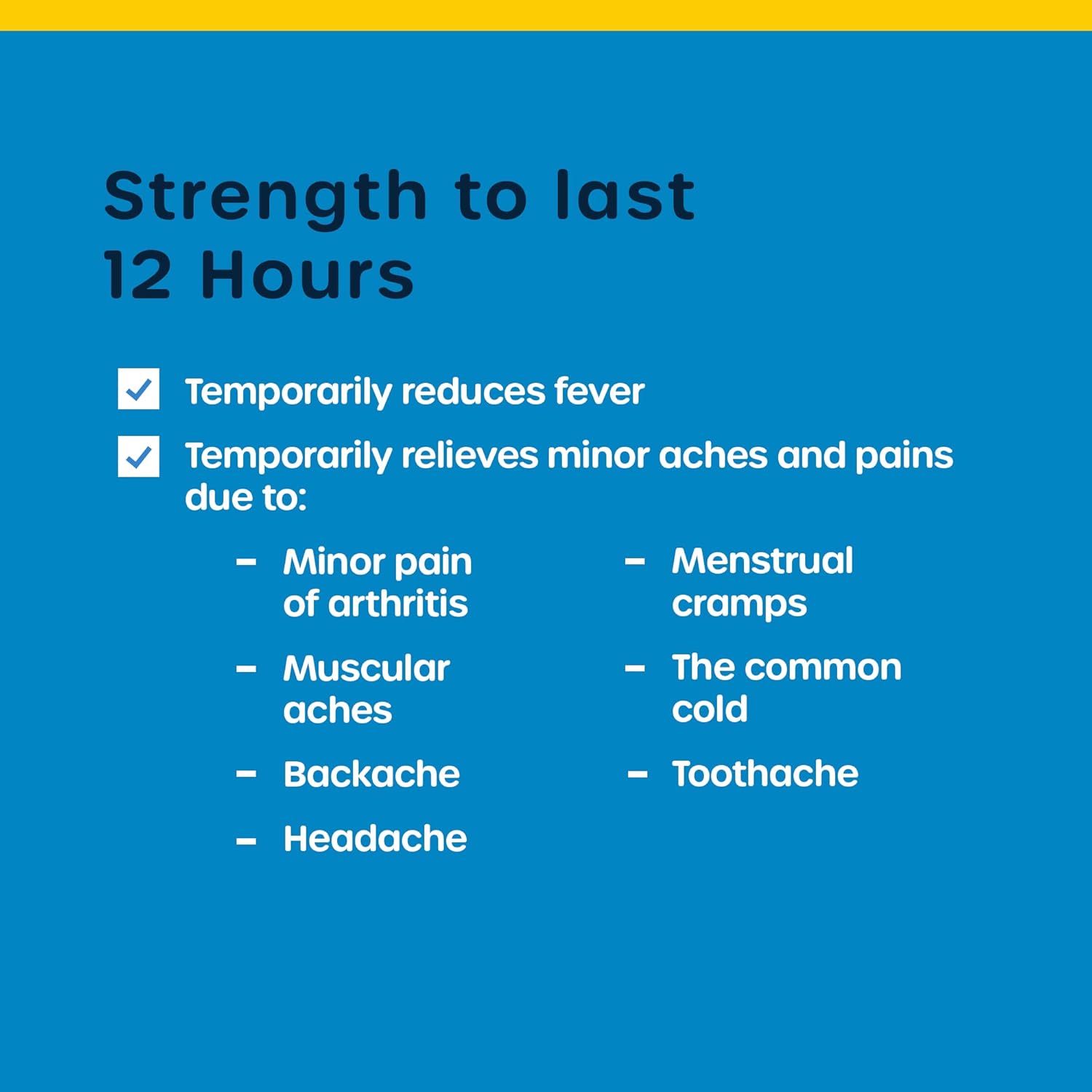 Naproxen Sodium caplets temporarily relieve minor aches and pains due to: minor pain of arthritis, muscular aches, backache, menstrual cramps, headache, toothache, the common cold; also temporarily reduces fever