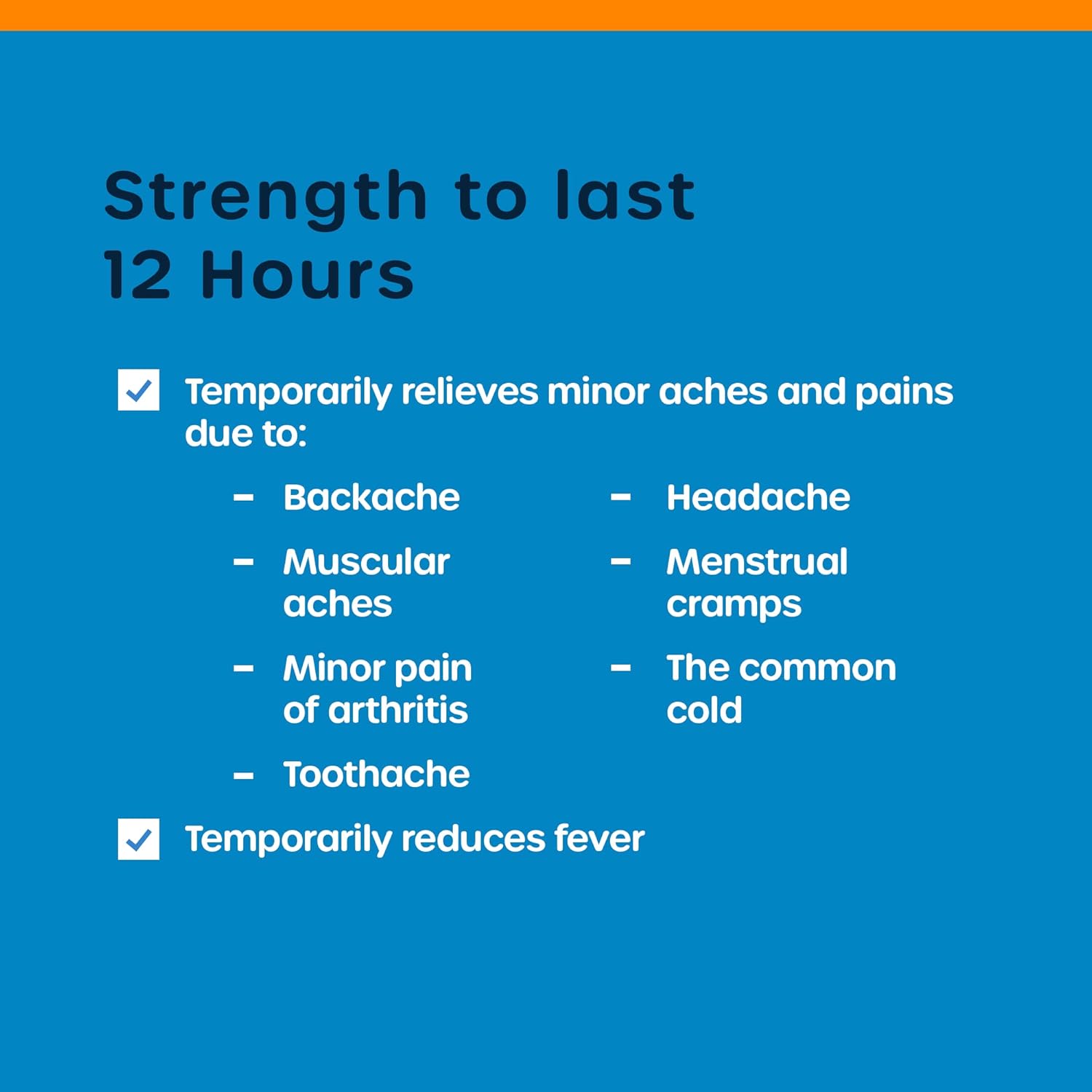 About this item Naproxen Sodium caplets temporarily relieve minor aches and pains due to: backache, muscular aches, minor pain of arthritis, menstrual cramps, headache, toothache, the common cold; also temporarily reduces fever cramps, headache, toothache, the common cold; also temporarily reduces fever Comparable to the national brand: Has the same active ingredient as Aleve Back and Muscle Pain Caplets* Effective pain and fever relief for up to 12 hours See package label for warnings, directions and other important information; use only as directed HSA or FSA Eligible See more product details,Naproxen Sodium caplets temporarily relieve minor aches and pains due to: backache, muscular aches, minor pain of arthritis, menstrual cramps, headache, toothache, the common cold; also temporarily reduces fever cramps, headache, toothache, the common cold; also temporarily reduces fever,Comparable to the national brand: Has the same active ingredient as Aleve Back and Muscle Pain Caplets,Effective pain and fever relief for up to 12 hours,See package label for warnings, directions and other important information; use only as directed,HSA or FSA Eligible