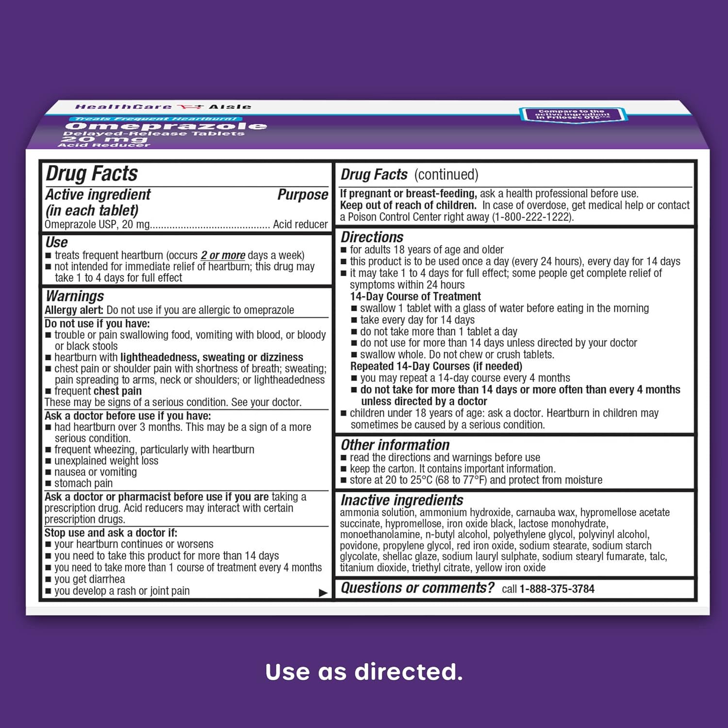 What are you doing about that frequent heartburn Yes, HEARTBURN – that burning and painful feeling in your throat or chest caused by refluxed stomach acid. Proton Pump Inhibitors, like HealthCareAisle Omeprazole Delayed Release Tablets 20 mg, stop acid production at the source - the pumps that release acid into the stomach. With just one tablet a day, you can treat frequent heartburn that occurs two or more days a week. Tips for Managing Heartburn: - Do not lie flat or bend over after eating - Do not wear tight-fitting clothing around the stomach - Do not eat before bedtime - Raise the head of your bed - Avoid heartburn-causing foods such as rich, spicy, fatty or fried foods, chocolate, caffeine, alcohol and certain fruits and vegetables - Eat slowly and avoid big meals - If overweight, lose weight - Quit smoking,Effective heartburn medicine: Omeprazole is an acid reducer that treats frequent heartburn (occurring 2 or more days a week),Stop heartburn at the source: Our Omeprazole tablets inhibit the proton pumps in the stomach from producing excess acid,All-day heartburn relief: Take one tablet daily to treat heartburn for up to 24 hours; use as directed for 14 days; do not take for more than 14 days or more often than every 4 months unless directed by a doctor,Not for immediate relief: May take 1 to 4 days for full effect; see package label for warnings and other important information,HSA or FSA Eligible