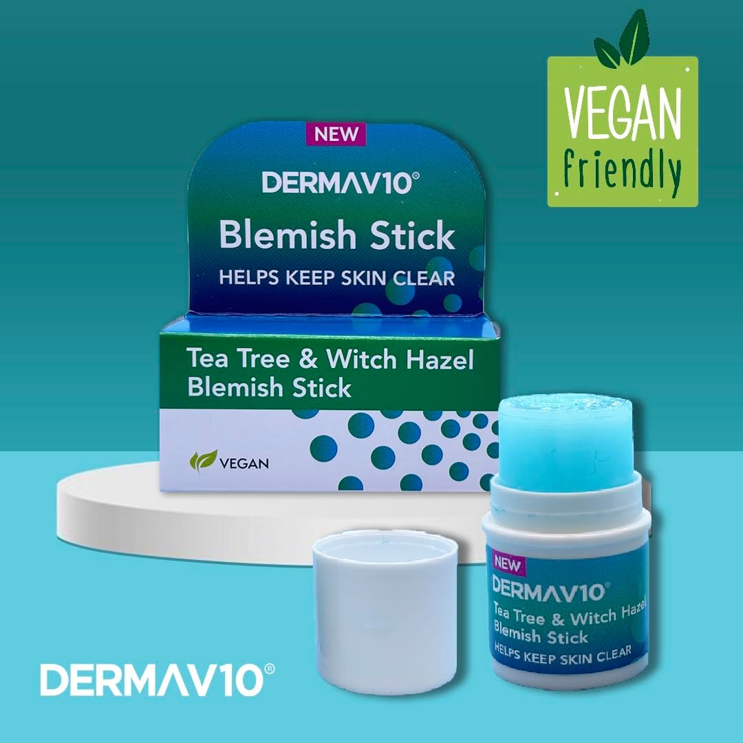 Product Description Derma V10s Blemish Stick gets to work instantly. Specially formulated using Tea Tree and Witch Hazel each application helps to fight spot causing bacteria, reduce excess oil and target blemishes. Witch Hazel is an antioxidant that can help to reduce inflammation, tighten pores and control oil production. Tea Tree is known for its antibacterial, anti-inflammatory and antioxidant properties. The specialised formula is gentle enough for everyday use. Ingredients Tea Tree, Witch Hazel P.when('A').execute(function(A) { A.on('a:expander:toggle_description:toggle:collapse', function(data) { window.scroll(0, data.expander.$expander[0].offsetTop-100); }); }); Safety Warning For external use only See more,DERMA V10 BLEMISH STICK β With tea tree and witch hazel to help calm and soothe the skin,TEA TREE β Known for its antibacterial, anti-inflammatory and antioxidant properties; Helps fight spot causing bacteria,WITCH HAZEL β Antioxidant that can help reduce inflammation and tighten pores; It also reduces excess oil and controls oil production,VEGAN FRIENDLY β Suitable for vegans; Gentle for everyday use,DERMVA V10 β One of the leading brands of beauty and personal care products; All of the products are quality approved in the UK