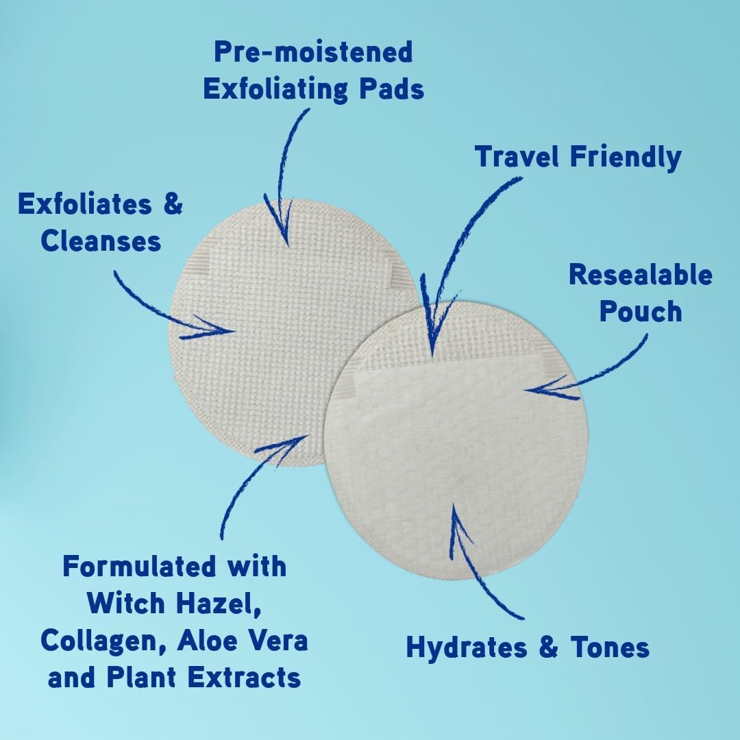 About The Product : EXFOLIATING PADS β Pack of 7 pre-moisturised exfoliating pads in a resealable pouch; The double-sided pads offer a 4-in-1 function to remove impurities and dirt from the skin