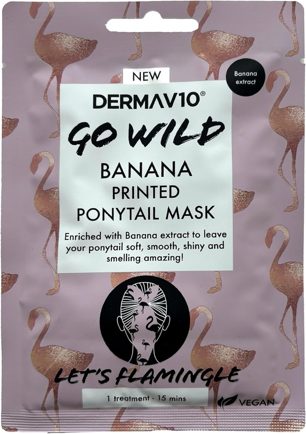 Product Description DermaV10s Go Wild Ponytail Mask is an essential step in your hair care ritual. It is enriched with banana extract to moisturise and revitalise each individual strand leaving hair soft, shiny and smelling divine. Banana extract nourishes and moisturises the hair strands combating dryness and promoting overall hair health. The nutrients that are present in banana extract help to strengthen the hair, leaving them looking smoother and less frizzy. The ponytail mask has a funky flamingo print making it perfect for pamper nights and selfies. Ingredients BANANA EXTRACT P.when('A').execute(function(A) { A.on('a:expander:toggle_description:toggle:collapse', function(data) { window.scroll(0, data.expander.$expander[0].offsetTop-100); }); }); Directions 1. Shampoo your hair as normal and towel dry. 2. Take out the mask and use scissors to cut along the straight edge. 3. Gather your ponytail inside the mask and fasten the adhesive tab. 4. Gently massage your hair so the product can be fully absorbed. 5. Leave the mask on for 15 minutes then remove and rinse hair thoroughly with warm water. Safety Warning FOR EXTERNAL USE ONLY. See more,DERMA V10 GO WILD PONYTAIL MASK β This sheet mask nourishes and moisturises each strand of hair; Leaves hair soft, shiny and smelling divine,BANANA EXTRACT β Helps combat dryness and promotes overall hair health; The nutrients in the banana extract help to strength the hair, leaving them looking smoother and less frizzy,VEGAN FRIENDLY β Suitable for vegans; Derma V10 is against animal testing,PAMPER NIGHTS β The ponytail mask has a funky flamingo print making it perfect for pamper nights and selfies; Suitable for all hair types and lengths