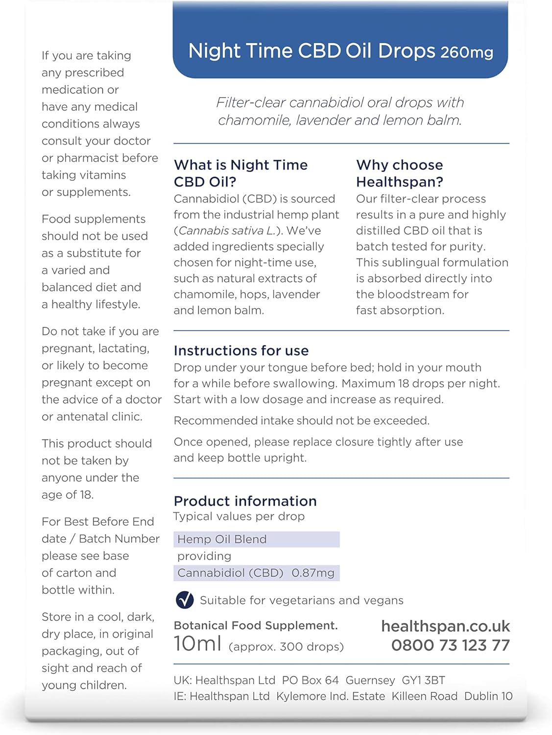 Healthspan 260Mg Night Time Cbd Oil Drops | With Chamomile, Hops, Lavender And Lemon Balm | Vegan