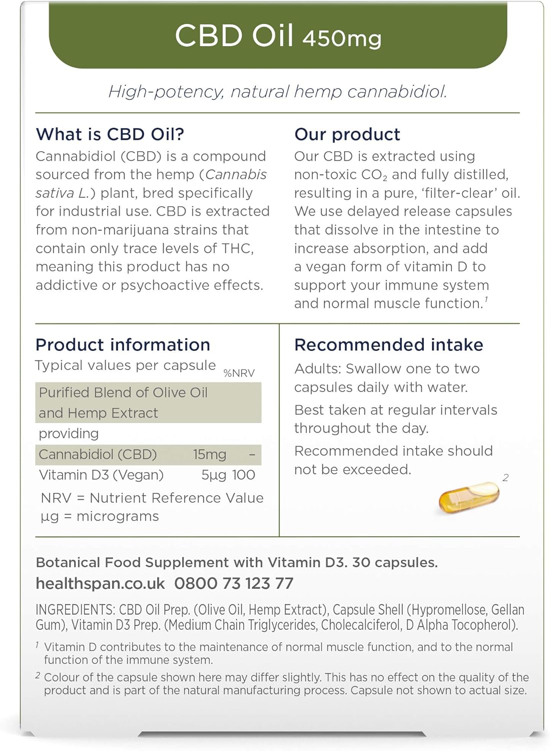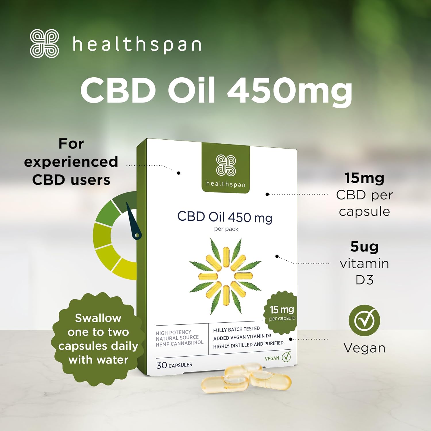 Healthspan 450Mg Cbd Oil Capsules | 30 Capsules | Added Vitamin D3 | Vegan
