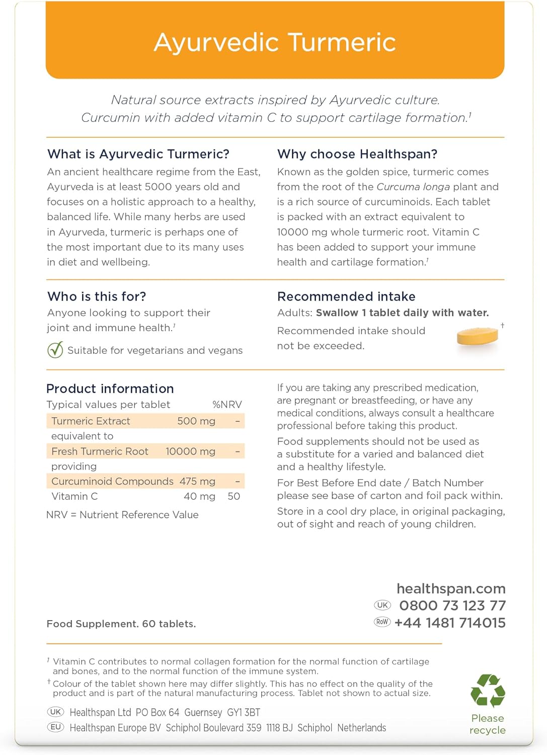 Healthspan Ayurvedic Turmeric | 60 Tablets | 95% High Curcuminoid Content | Added Vitamin C | Supports Joint And Immune Health | Vegan Friendly
