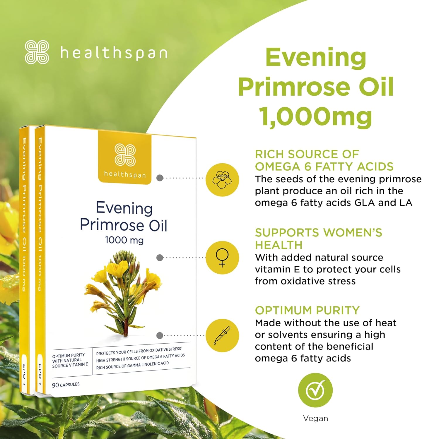 Healthspan Evening Primrose Oil | Support Women'S Health | Helps Maintain Hormonal Balance | Rich Source Of Omega 6 Fatty Acids | Added Vitamin E | Vegan (180 Capsules, 1,000Mg)
