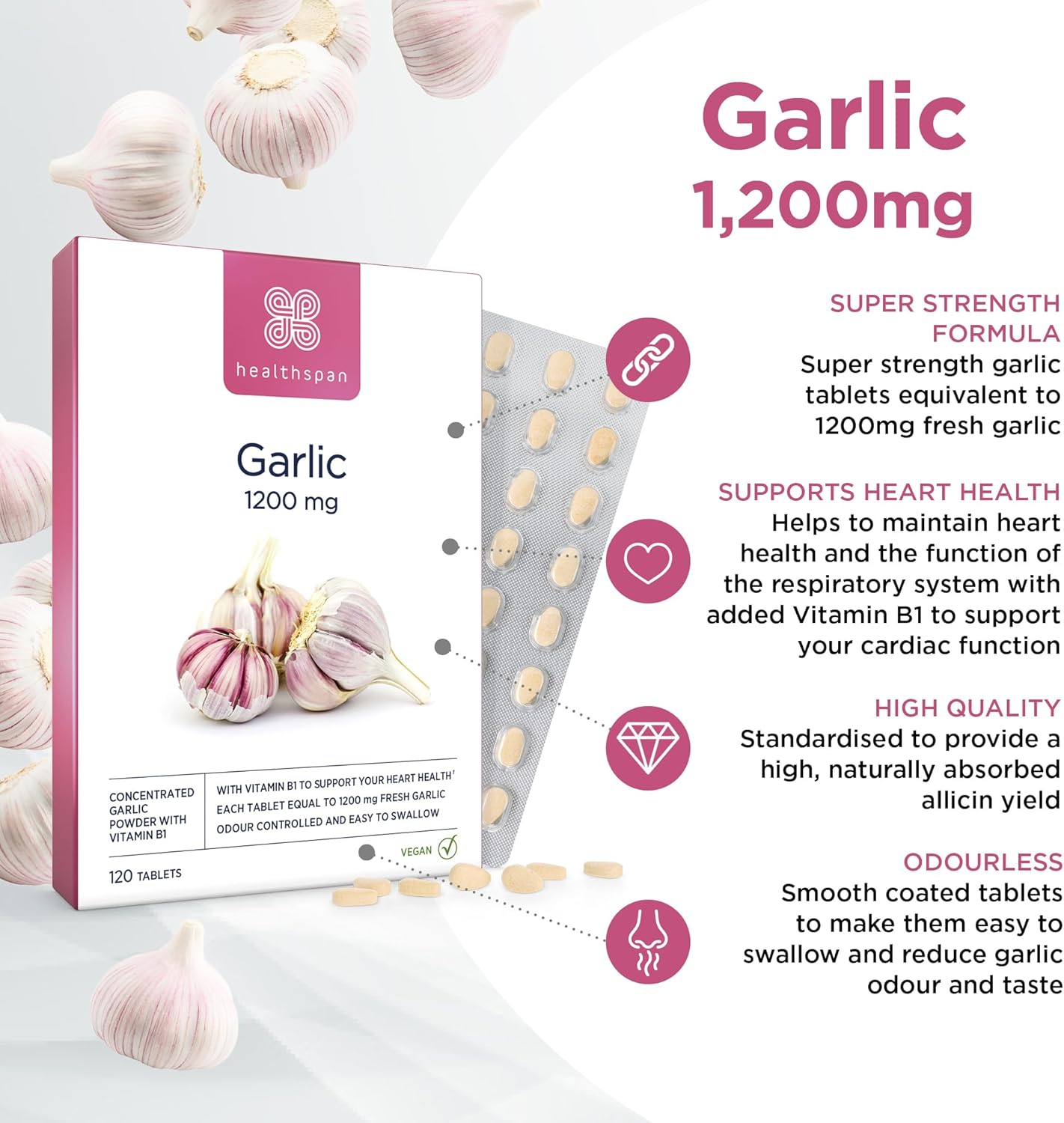 Healthspan Garlic 1,200Mg (120 Tablets) | Supports Heart Health & The Respiratory System | Maintains Normal Cholesterol Levels | Added Vitamin B1 | Odour-Controlled & Easy To Swallow | Vegetarian