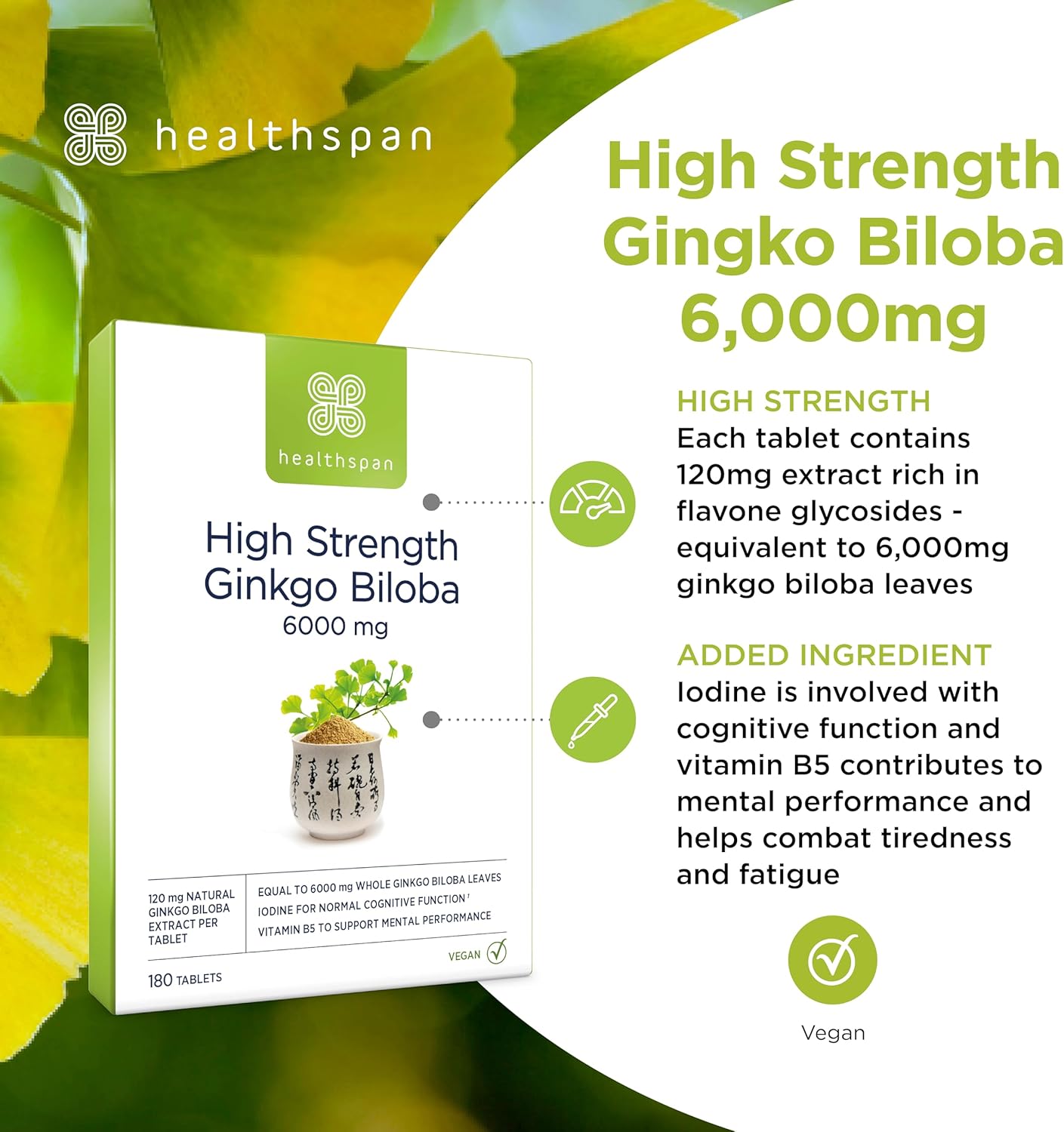 Healthspan Ginkgo Biloba 6,000Mg | High Strength | 180 Tablets | Iodine | Vitamin B5 | Flavone Glycosides | Vegan