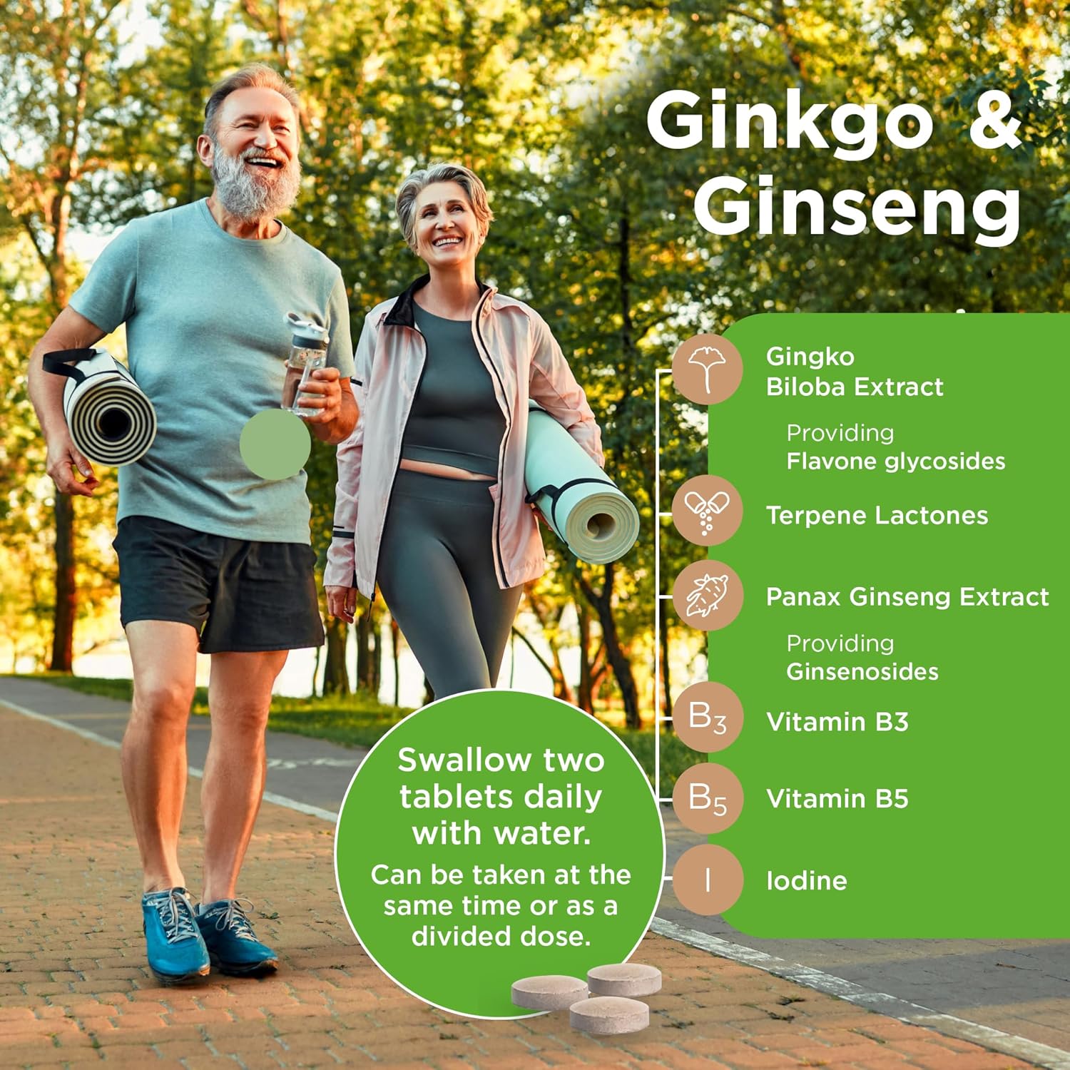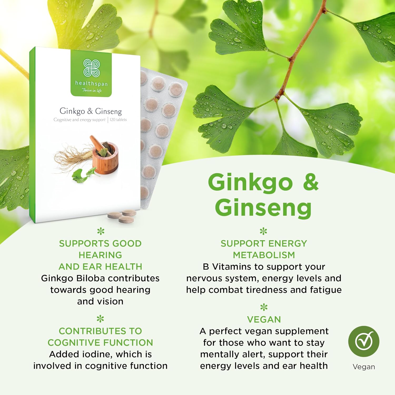 Healthspan Ginkgo & Ginseng Cognitive Support | 120 Tablets | Ginkgo Biloba | Panax Ginseng Extracts | Iodine | Vitamin B3 | Vitamin B5 | Vegan