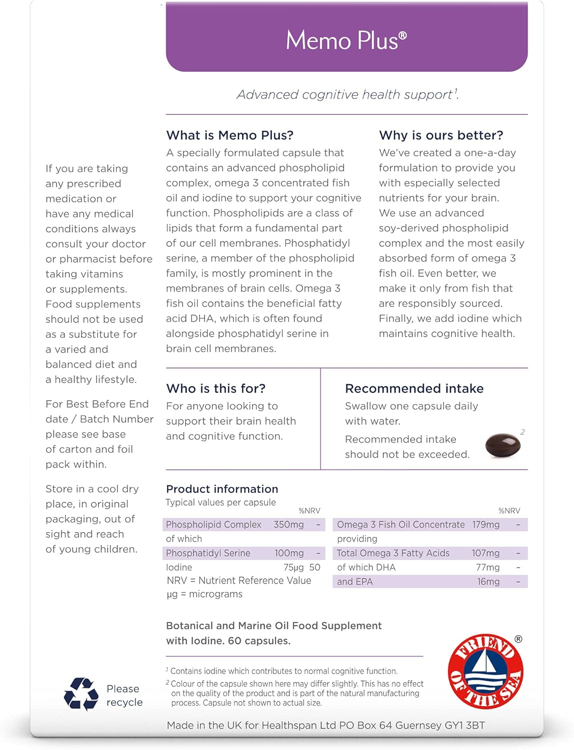 Healthspan Memo Plus (2 Months' Supply) | To Support Your Brain Health & Cognitive Function | 350Mg Advanced Phospholipid Complex | 179Mg Omega 3 Fish Oil | 75µg Iodine | Friend Of The Sea | One-A-Day