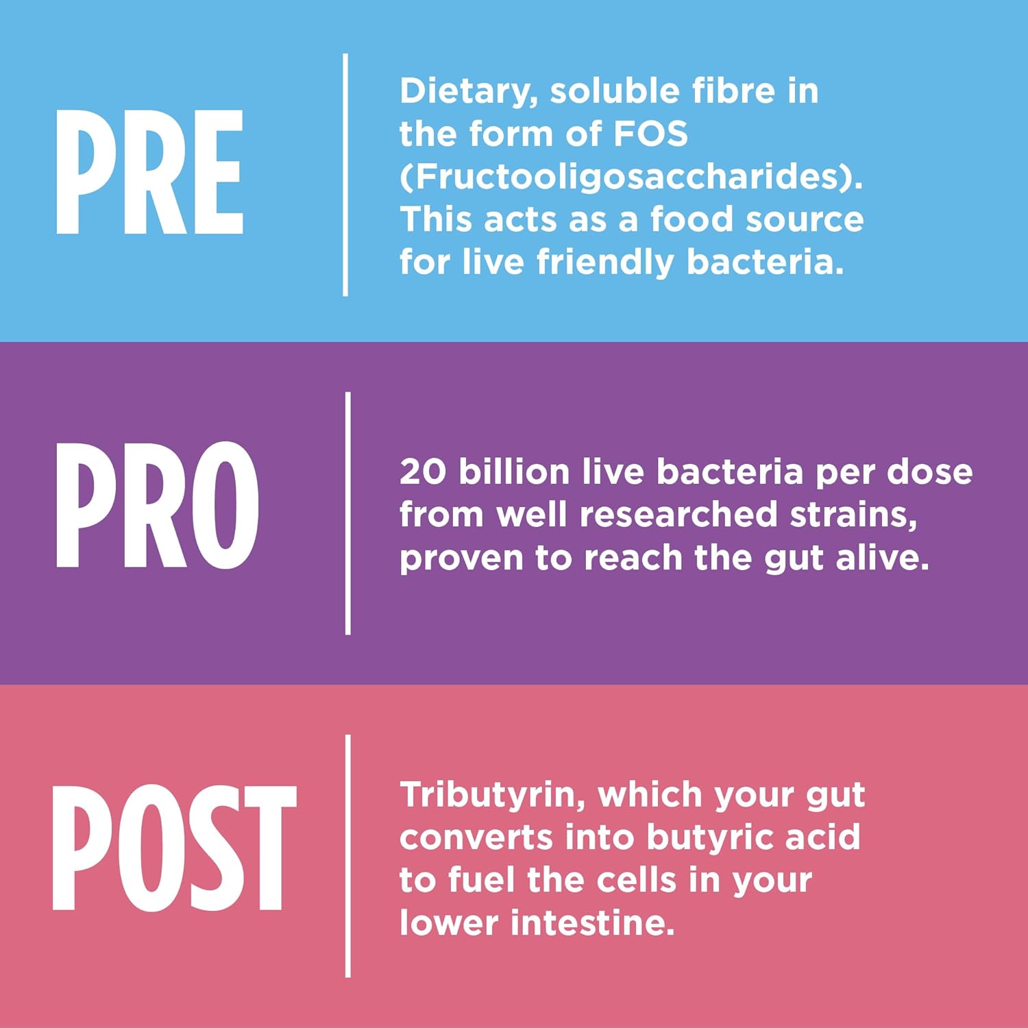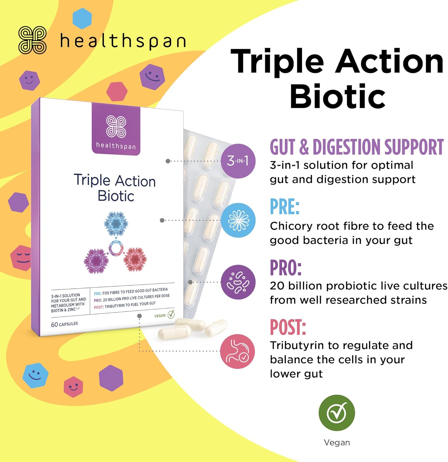 Healthspan Triple Action Biotic | Optimal Gut & Digestion Support | Pre, Pro & Post Gut Health | Chicory Root Fibre | 20 Billion Probiotic Bacteria | Plus Tributyrin | Added Biotin & Zinc | Vegan