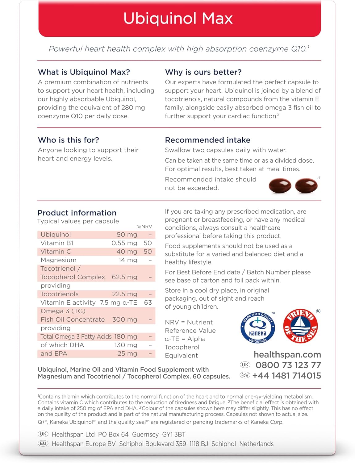 Healthspan Ubiquinol Max | 60 Capsules | With Vitamin C & Vitamin B1 | Tocotrienol Complex | Omega 3 Fish Oil | 280Mg Coq10