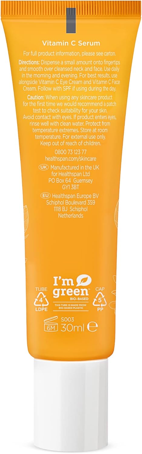Healthspan Vitamin C Serum (30Ml) | Boost Radiance & Smooth Lines & Wrinkles | Triple Source Vitamin C To Support Collagen Formation | With Ferulic Acid, Hyaluronic Acid And Vitamin E | Vegan