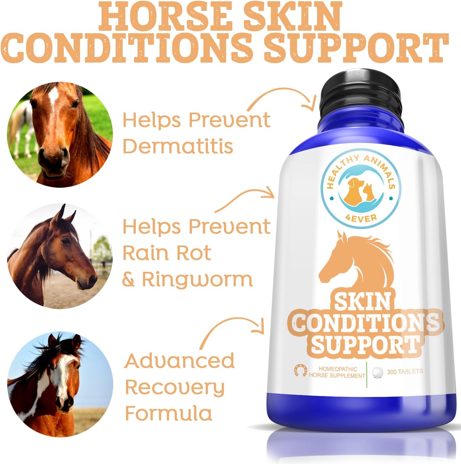 Healthy Animals 4Ever All-Natural Horse Skin Conditions Support - Helps Prevent Dermatitis, Rain Rot & Ringworm - Supplements For Horses - Homeopathic & Highly Effective - 300 Tablets