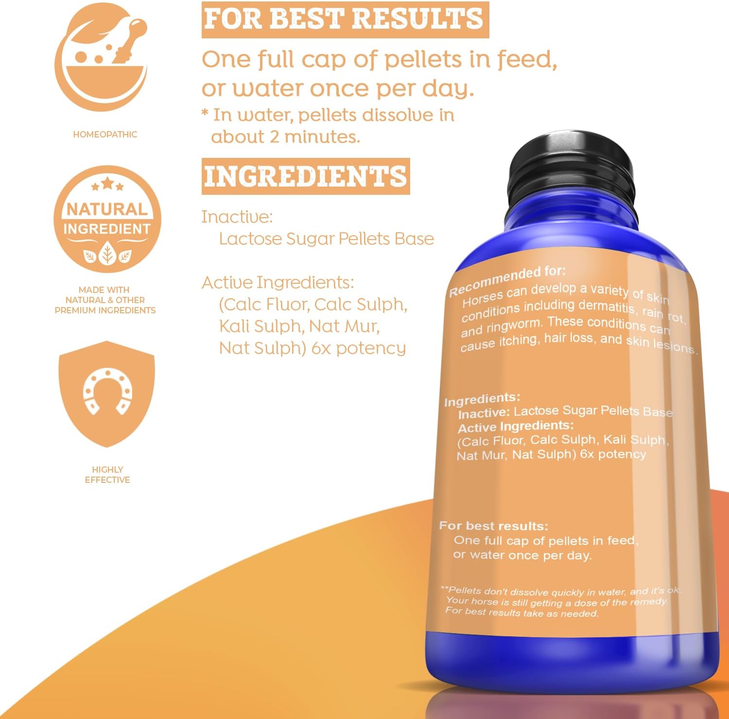 ADVANCED RECOVERY FORMULA: Provide unparalleled healing and recovery for your horse's skin conditions with our scientifically developed formula. Specially crafted to address Dermatitis, Rain Rot, Ringworm, and other skin conditions, our horse supplement will help your horse overcome these conditions. Put your beloved pets' health first with Healthy Animals 4Ever’s All-Natural Horse Skin Condition SupportQUICK RECOVERY: Ensure continuous care and support for your equine companion with our generous 300 count supply. Experience a full month of effective, lasting skin condition management without any interruptions including hair loss, itching, and skin lesions. Using this horse supplement consistently will ensure help improve health and balance for all of your horsesEASY APPLICATION: No fuss or stress during administration. Our dissolvable pellets are effortless to administer. Simply add a cap of pellets to your horse's drinking water for hassle-free consumption, or mix with their favorite feedSAFE SUPPLEMENTS FOR YOUR BELOVED PETS: Have complete peace of mind as you care for your pets with this all-natural, organic, non-GMO, gluten free, preservative free, and chemical free supplement. Developed with the same care and quality you’d expect from your own supplements, this specially designed pet formula was carefully crafted in an FDA registered facility to ensure the highest possible standards